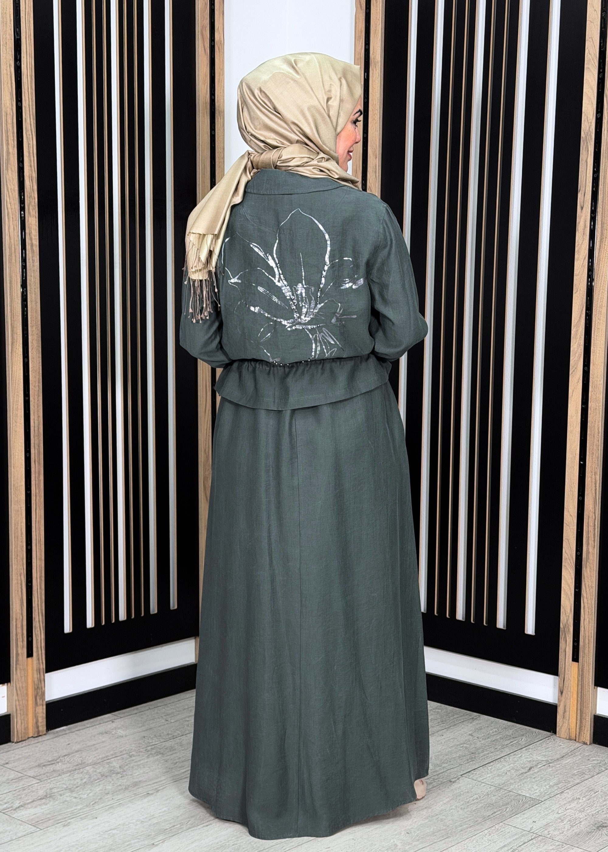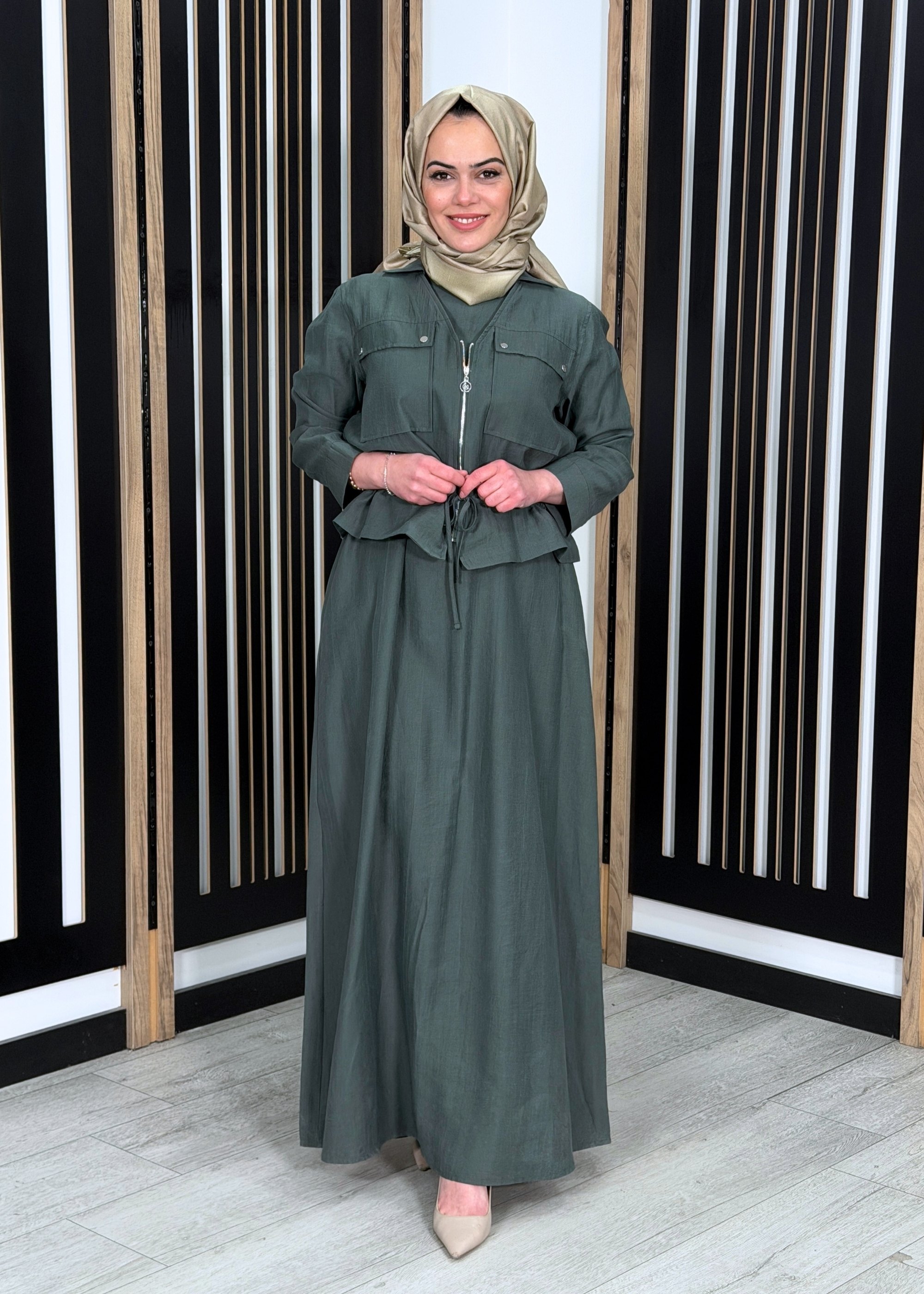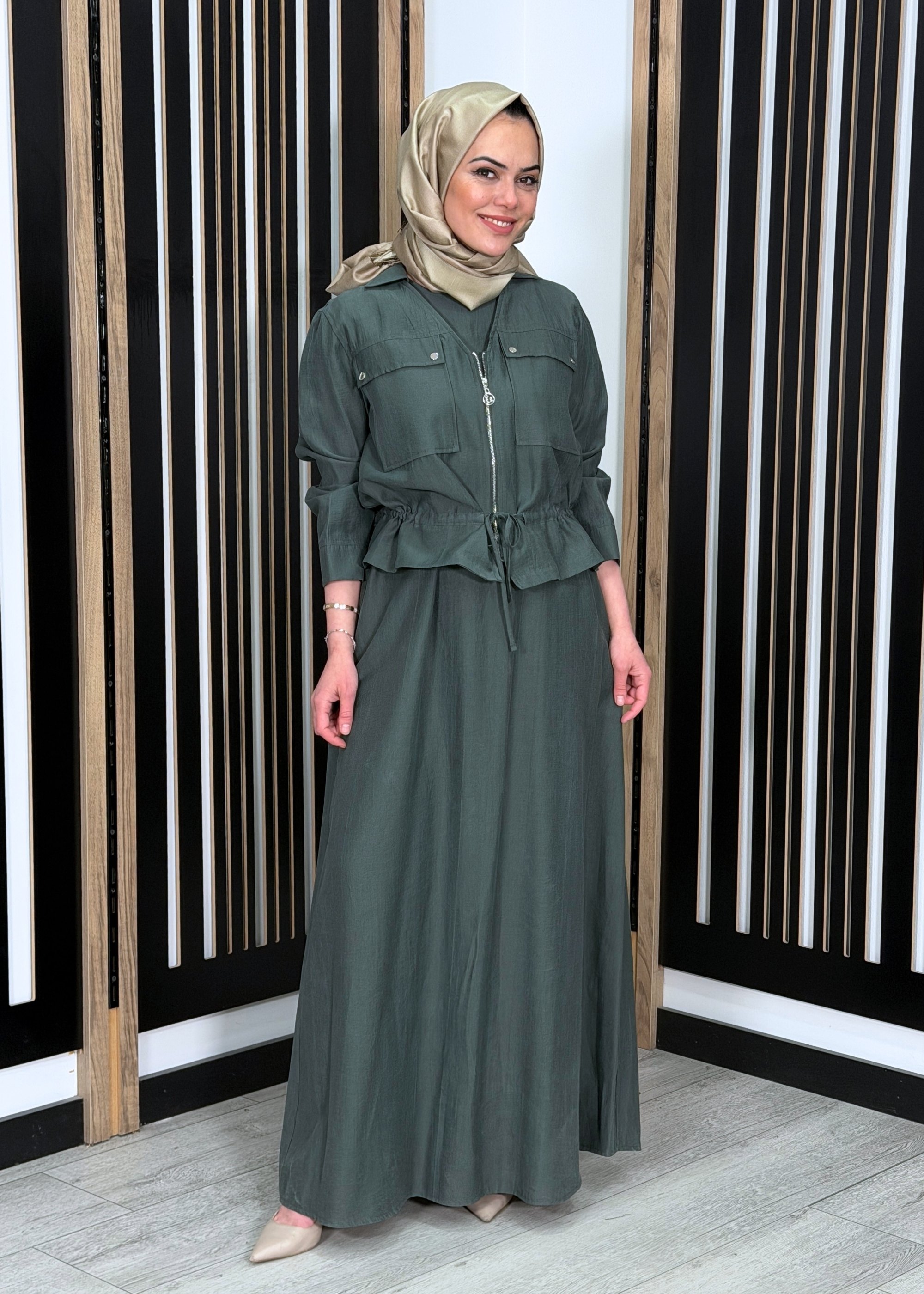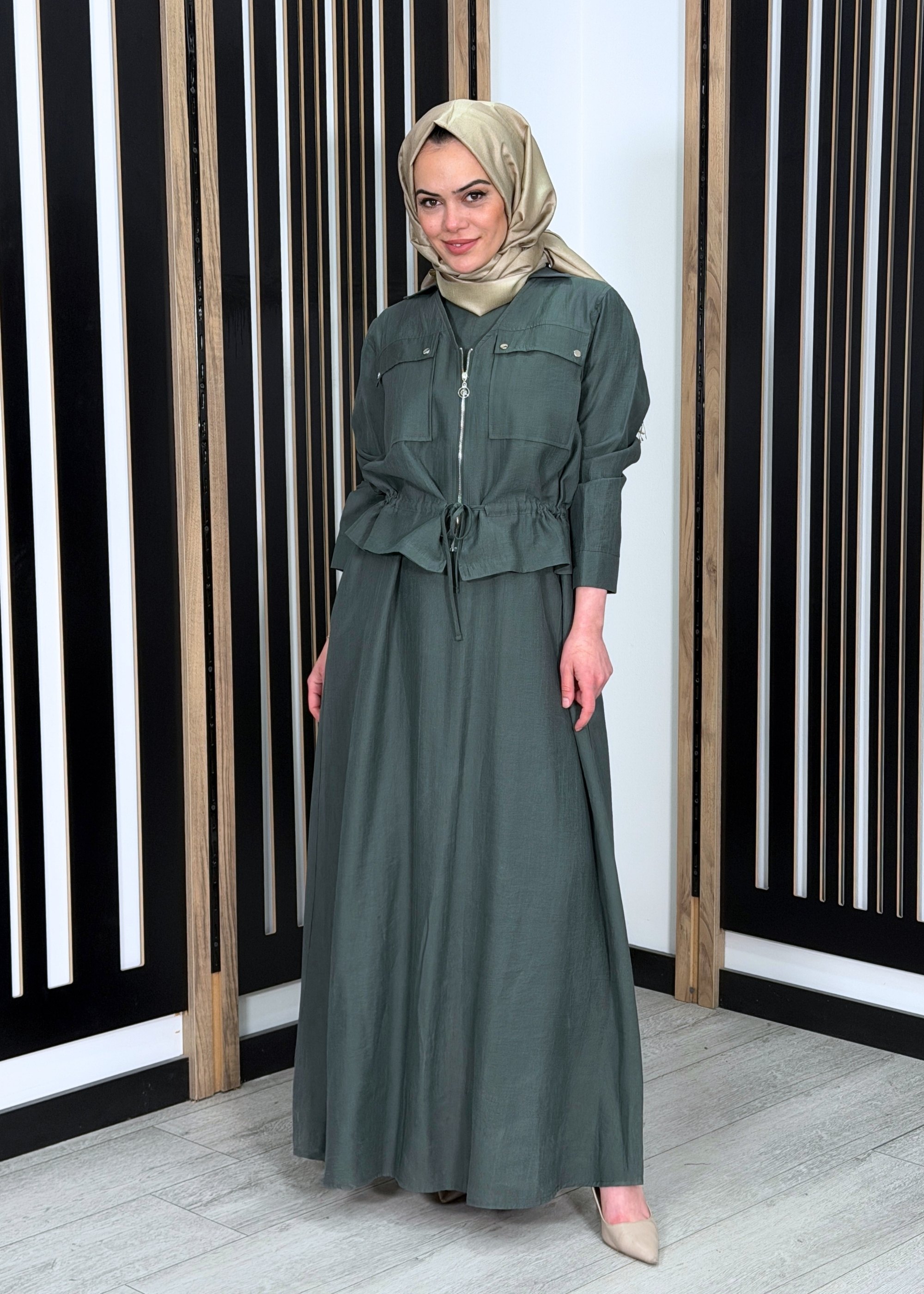 Ceremony Beli Büzgülü ve Fermuar Detaylı Safari Bolerolu Elbise YEŞİL