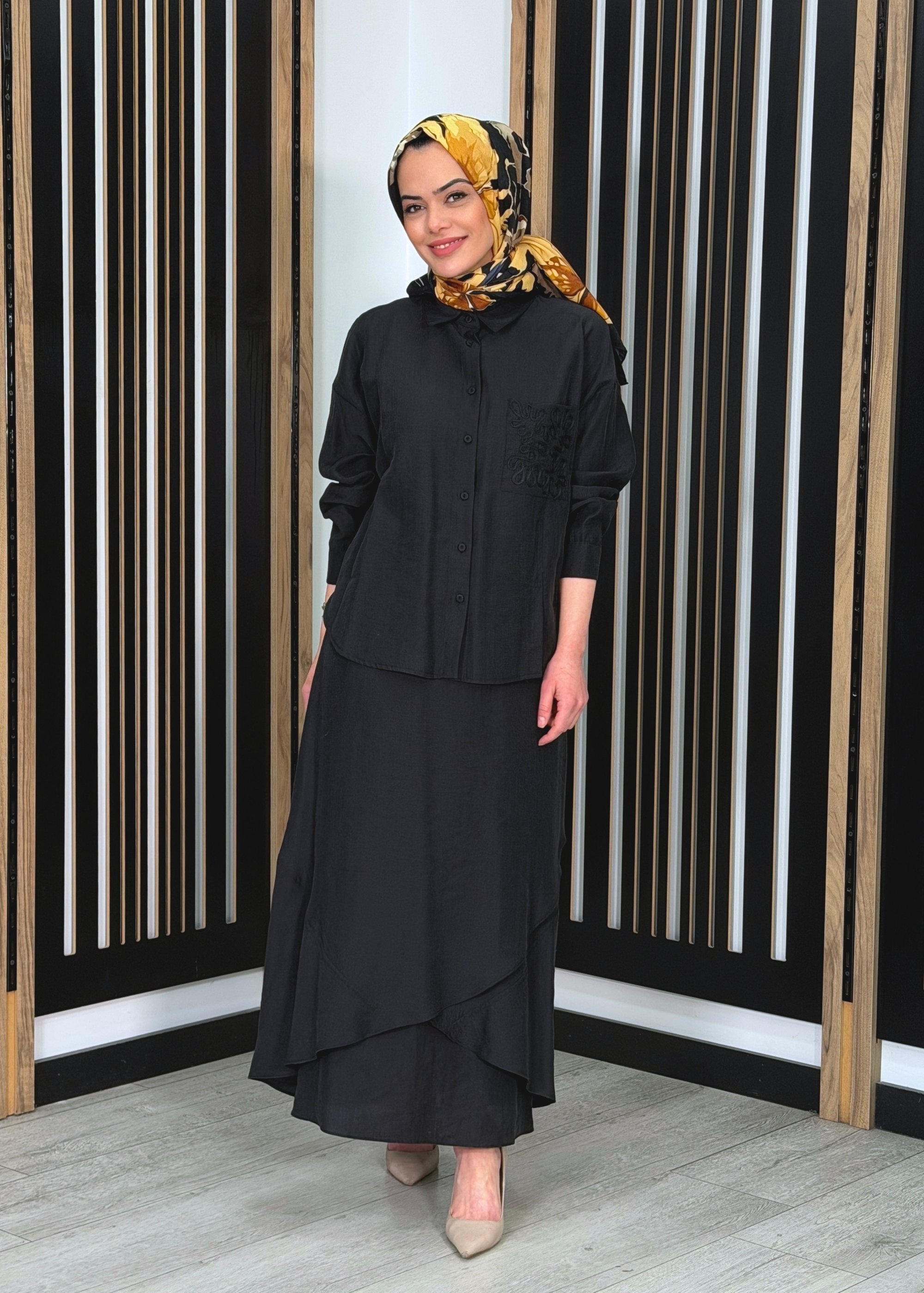 MissWhence Kabartma Baklava Dilimli İpek Etekli Takım SİYAH
