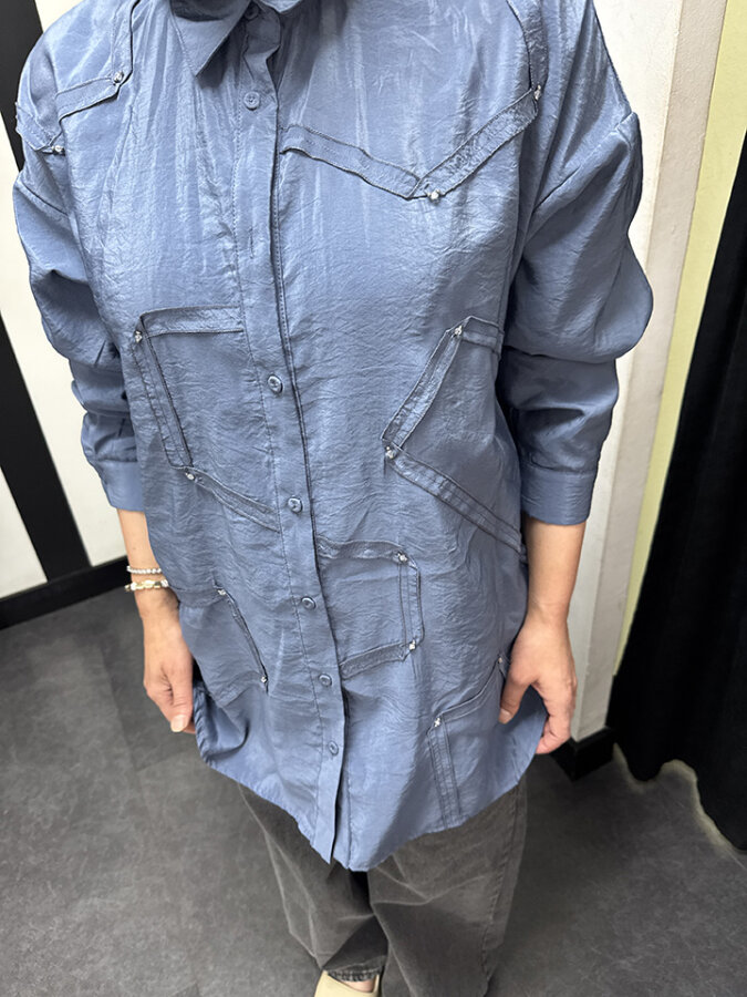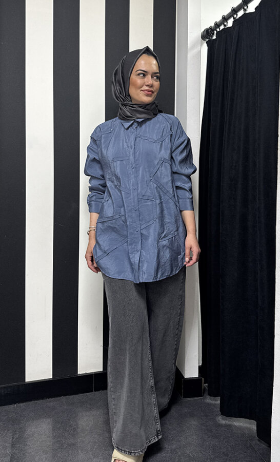 Ceremony Düğmeli Uzun Kollu Dekoratif Dikişli Gömlek İNDİGO