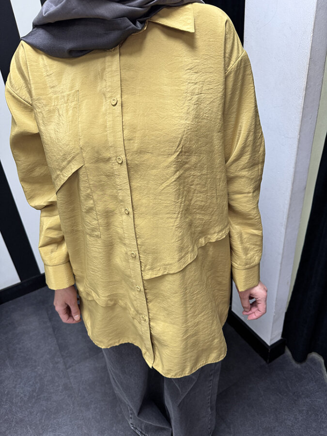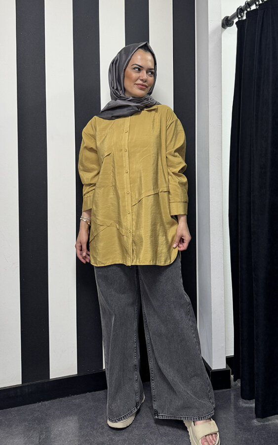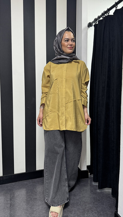Ceremony Önden Düğmeli Uzun Cep Detaylı Tunik HARDAL
