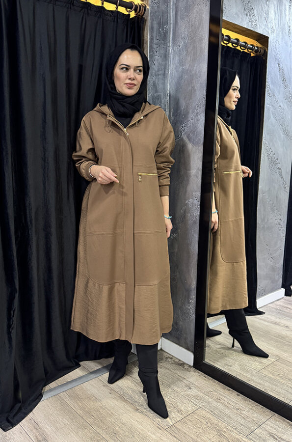 Ceremony Önden Patlı Cepleri Fermuarlı Kapüşonlu Dubai Garnili Çelik Kap CAMEL