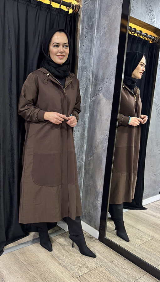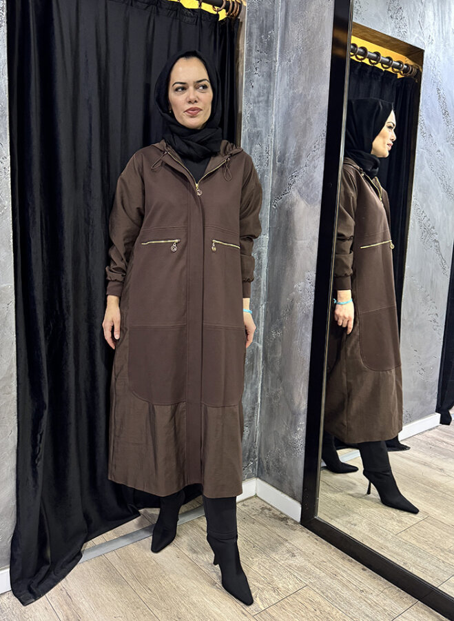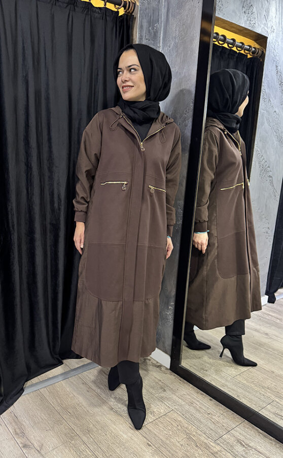 Ceremony Önden Patlı Cepleri Fermuarlı Kapüşonlu Dubai Garnili Çelik Kap KAHVERENGİ