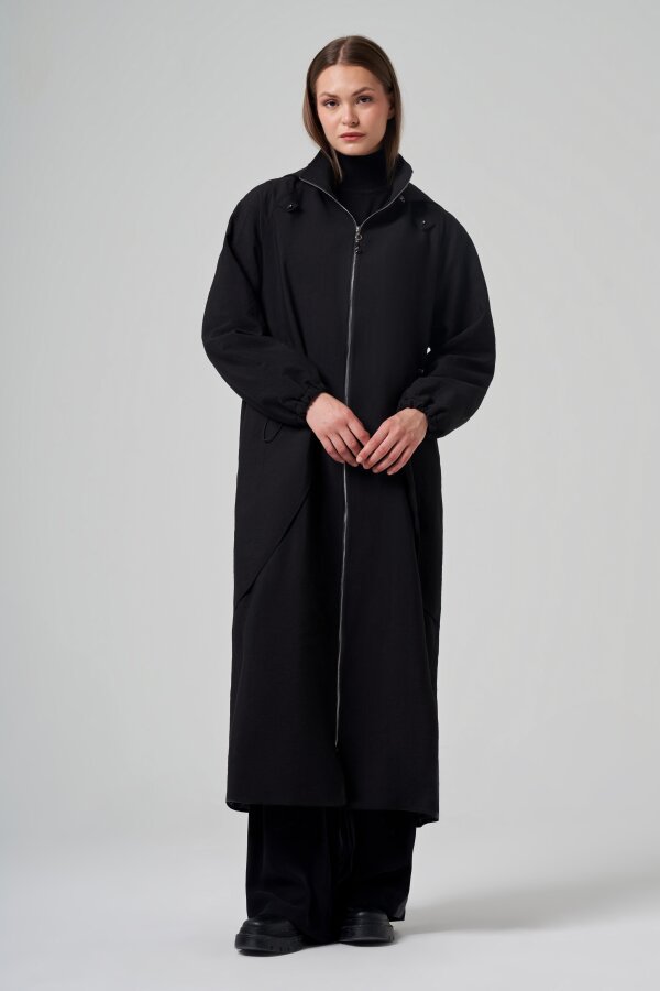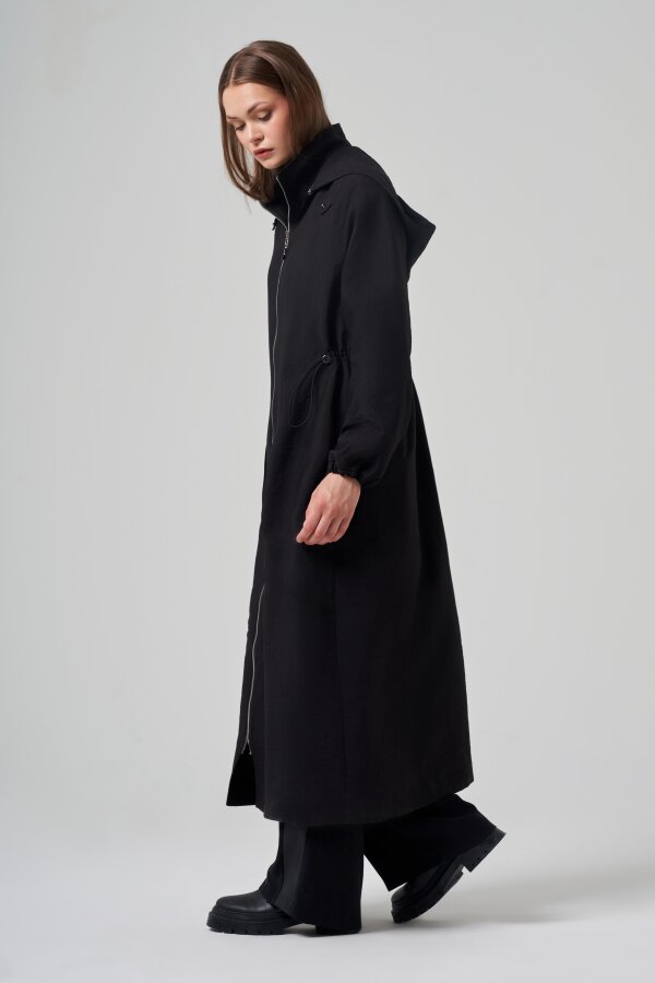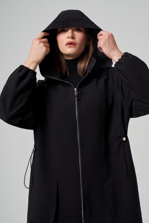 Ceremony Yanları Allerli Kapüşonlu Trençkot SİYAH