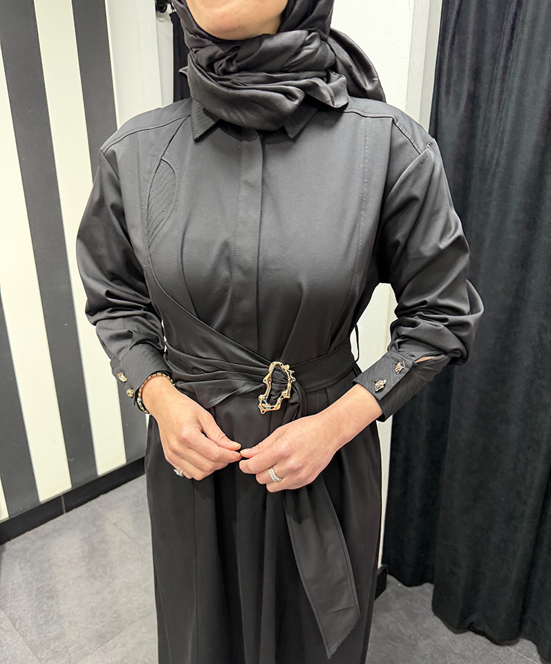 Yeşim Özcan Kolları Taş Detaylı Kat Kat Elbise GRİ