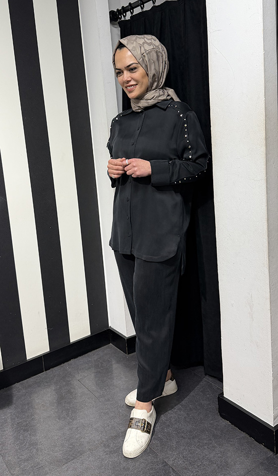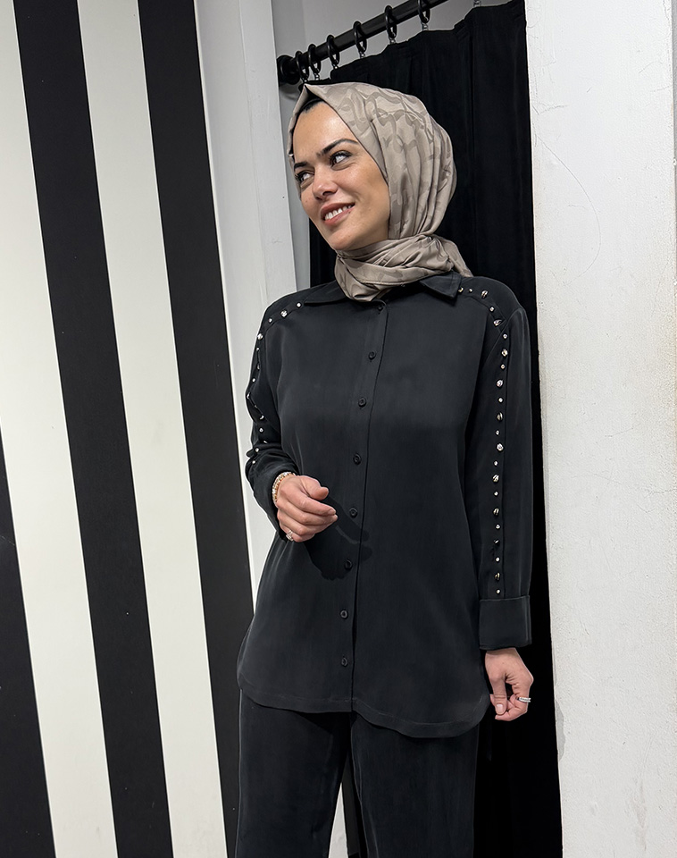 Clande Kolu Taşlı Cupra Bluz SİYAH