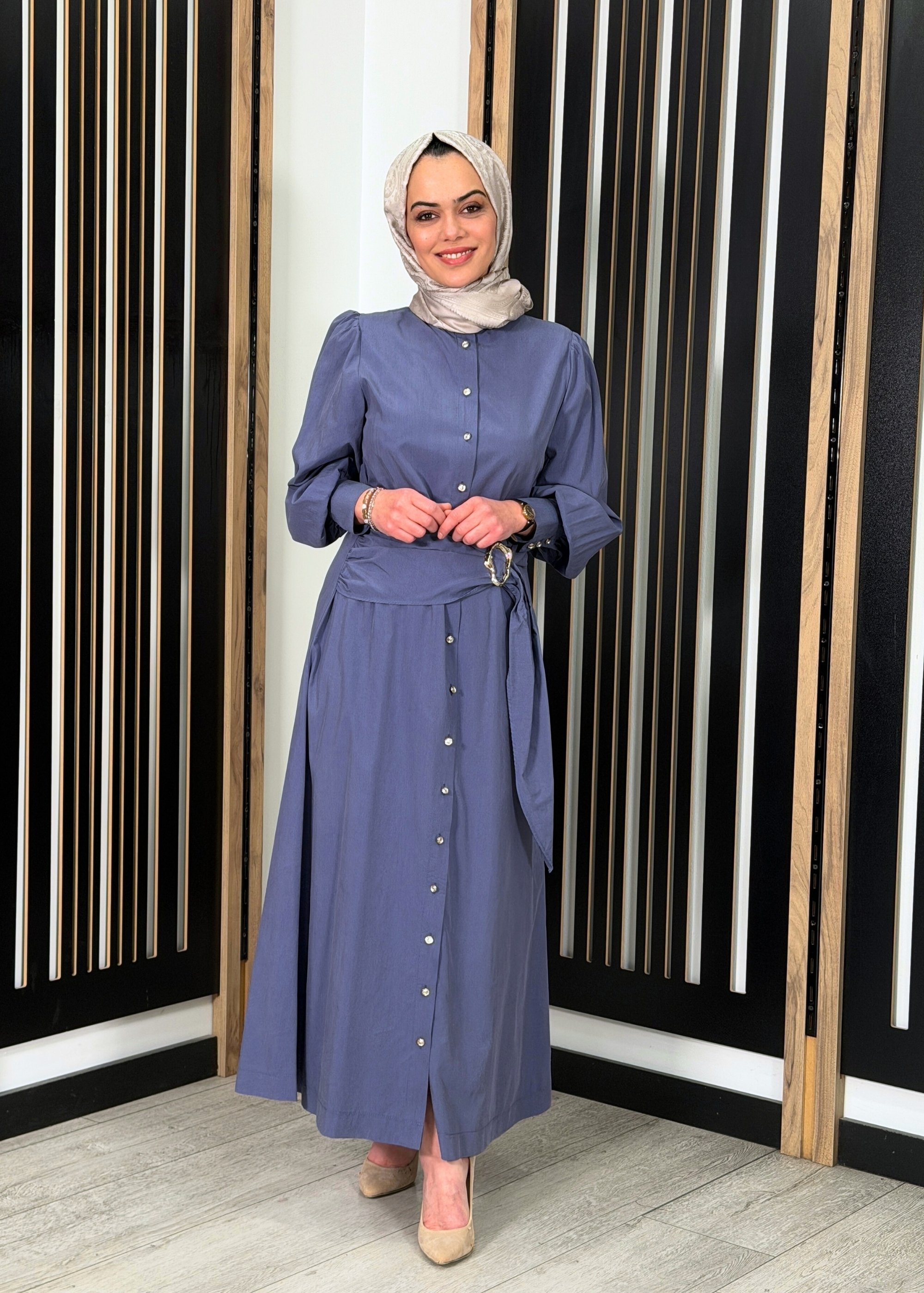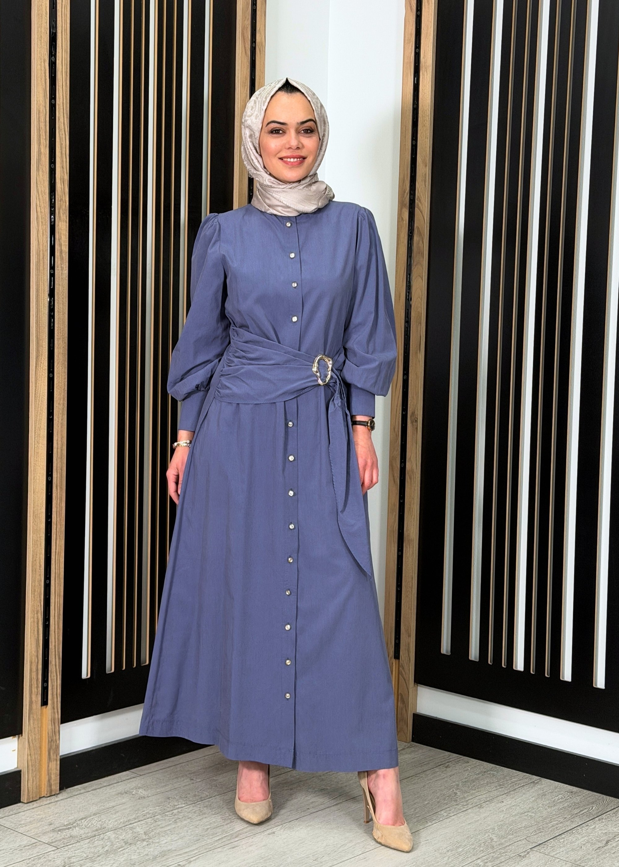 Clande Önü Düğmeli Beli Tokalı Elbise İNDİGO - 1Clande Önü Düğmeli Beli Tokalı Elbise İNDİGO - 2Clande Önü Düğmeli Beli Tokalı Elbise İNDİGO - 3