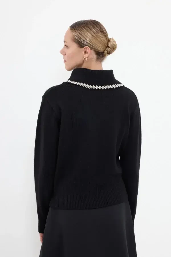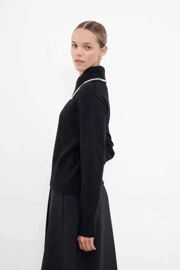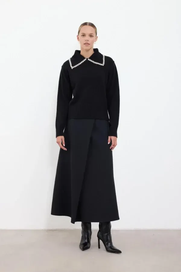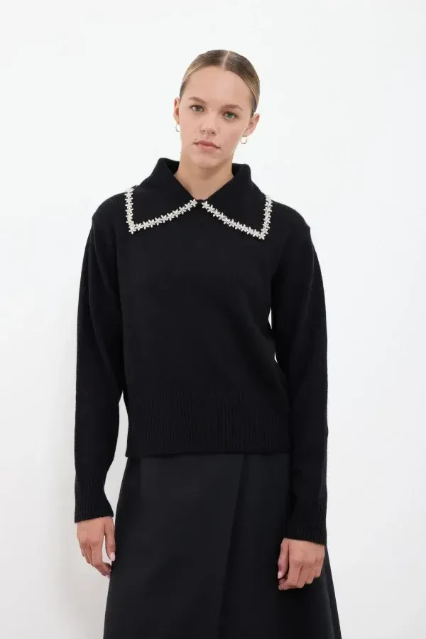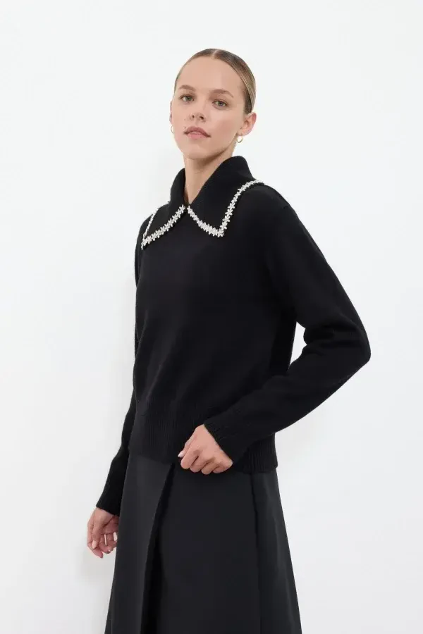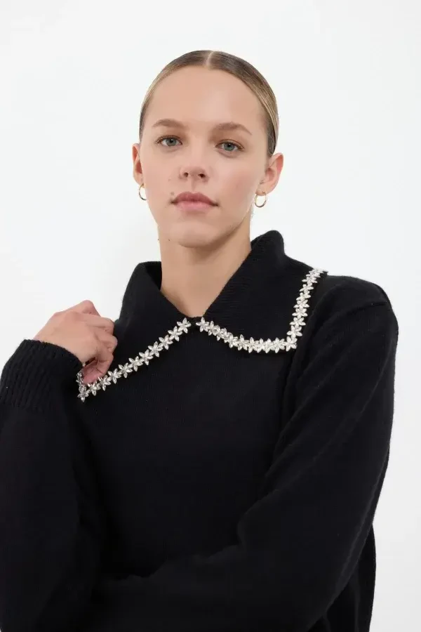 Cloche Taşlı Yakalı Triko Kazak SİYAH