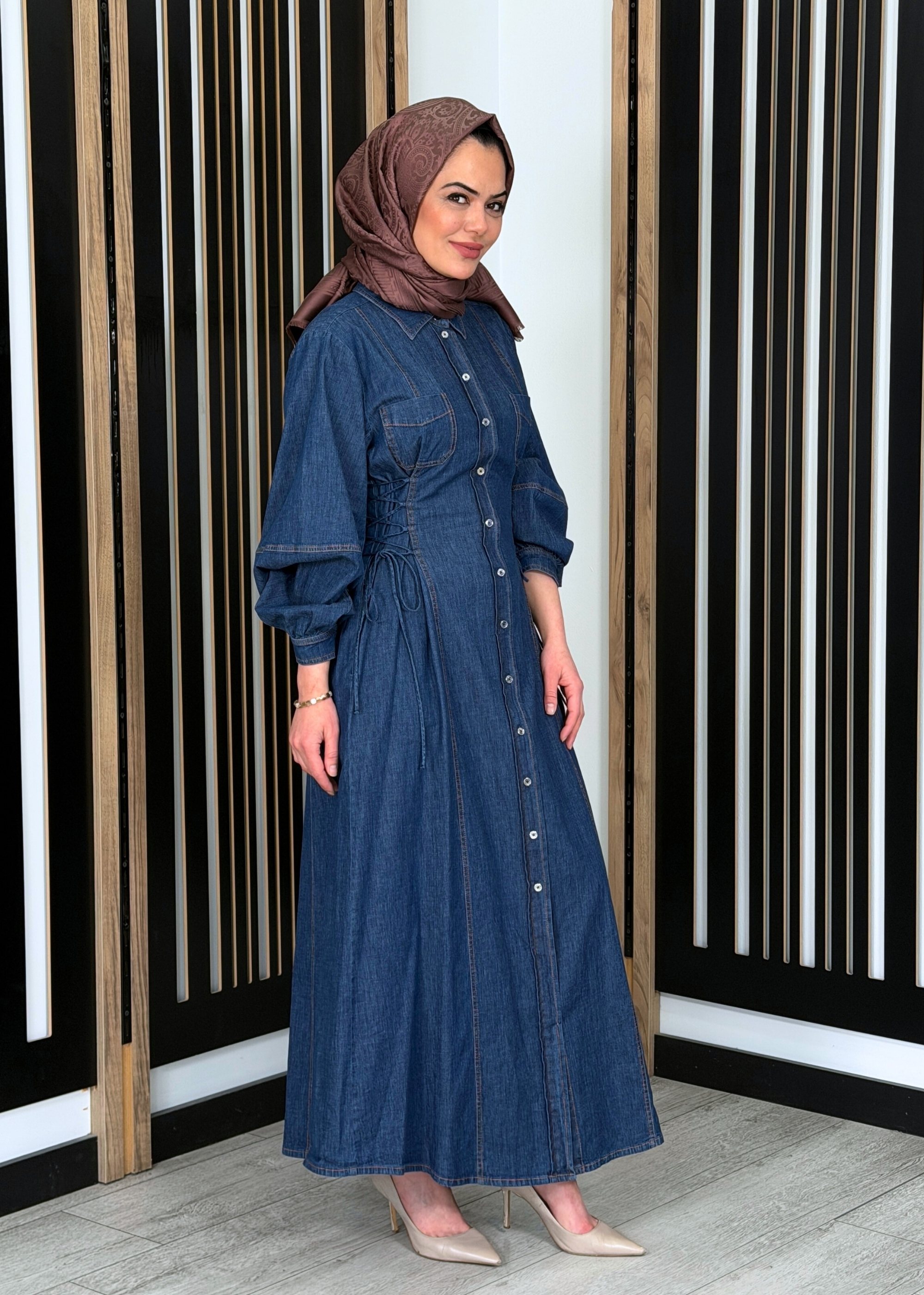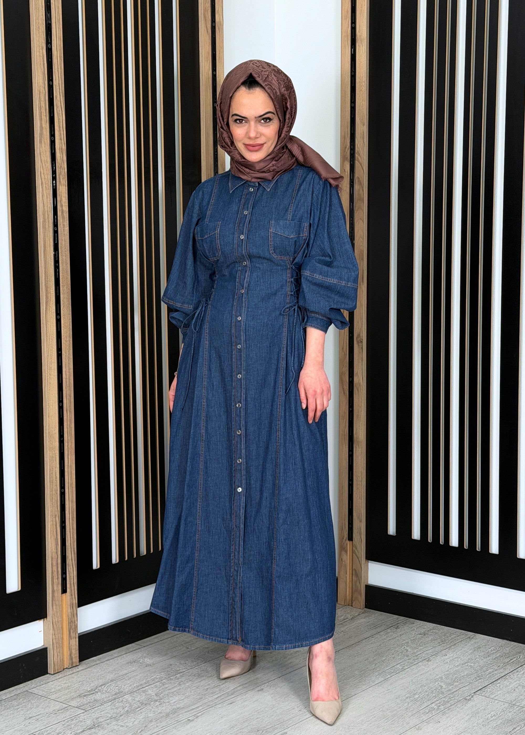 Rahat kalıbı ve spor-şık duruşuyla öne çıkan bu elbise, tesettür giyimde hem günlük hem de şehir stiline uyum sağlar. Önü düğmeli tasarımı ve bel kısmındaki ayarlanabilir formu ile hem kullanışlı hem de stil sahibi bir görünüm sunar.