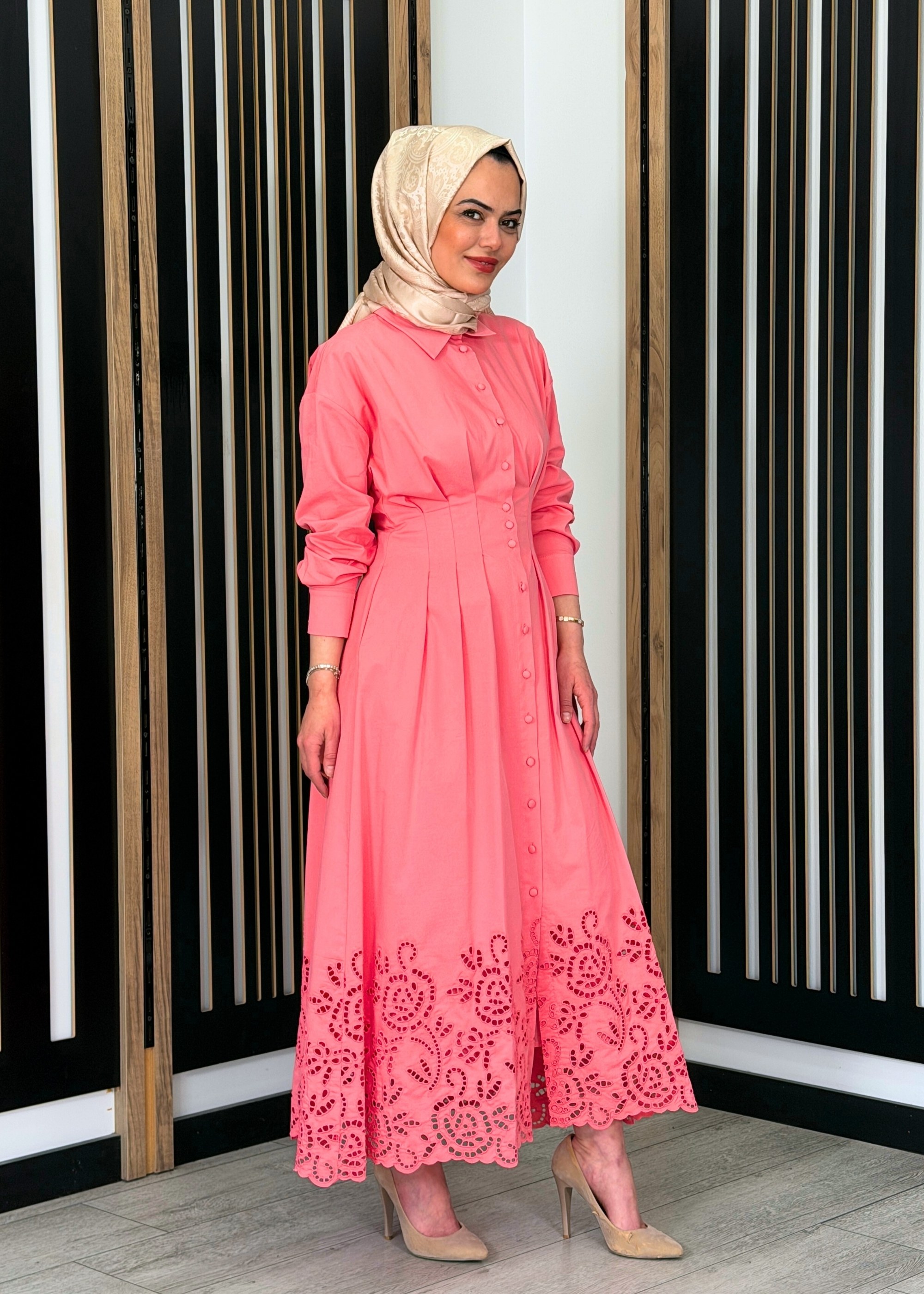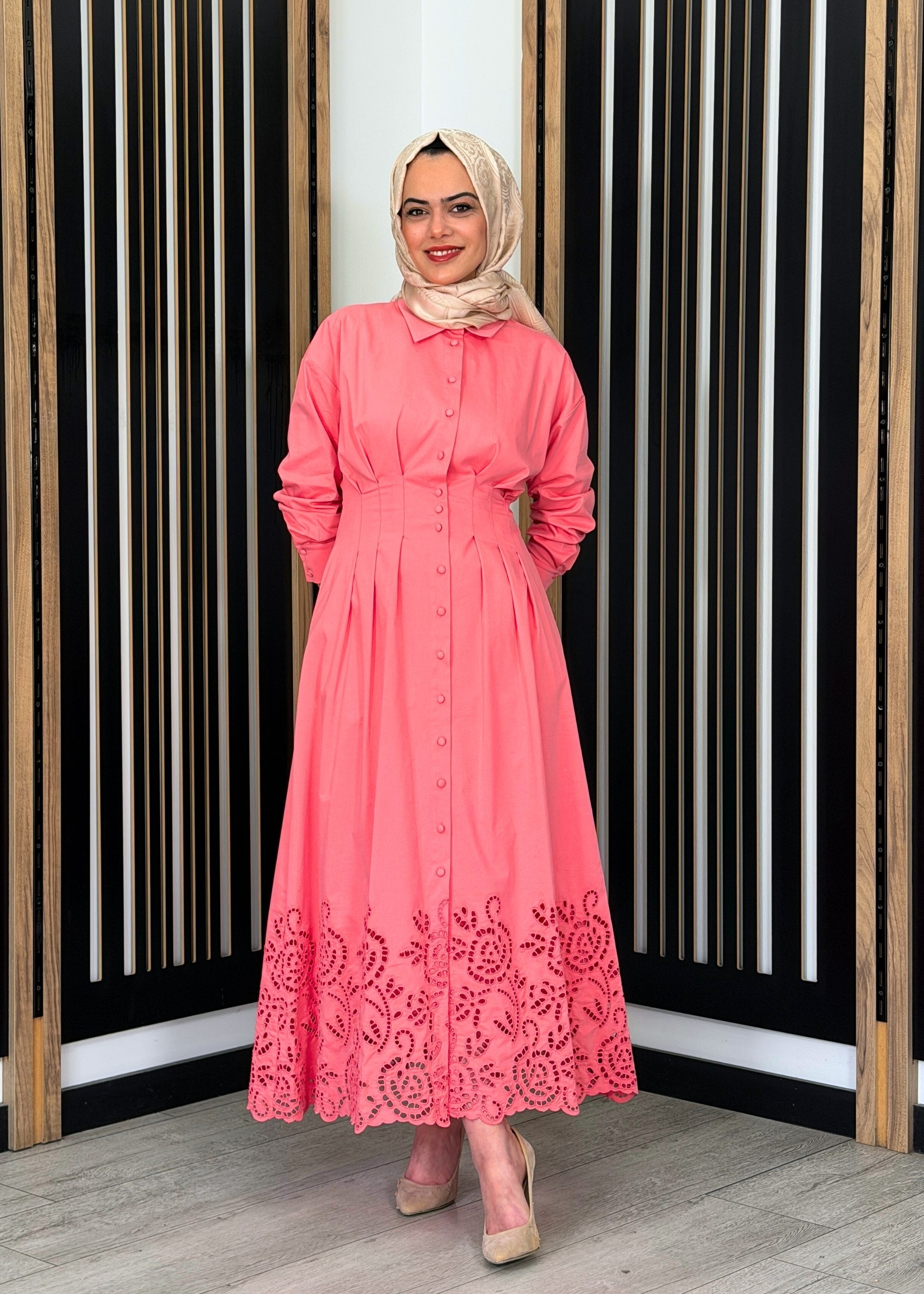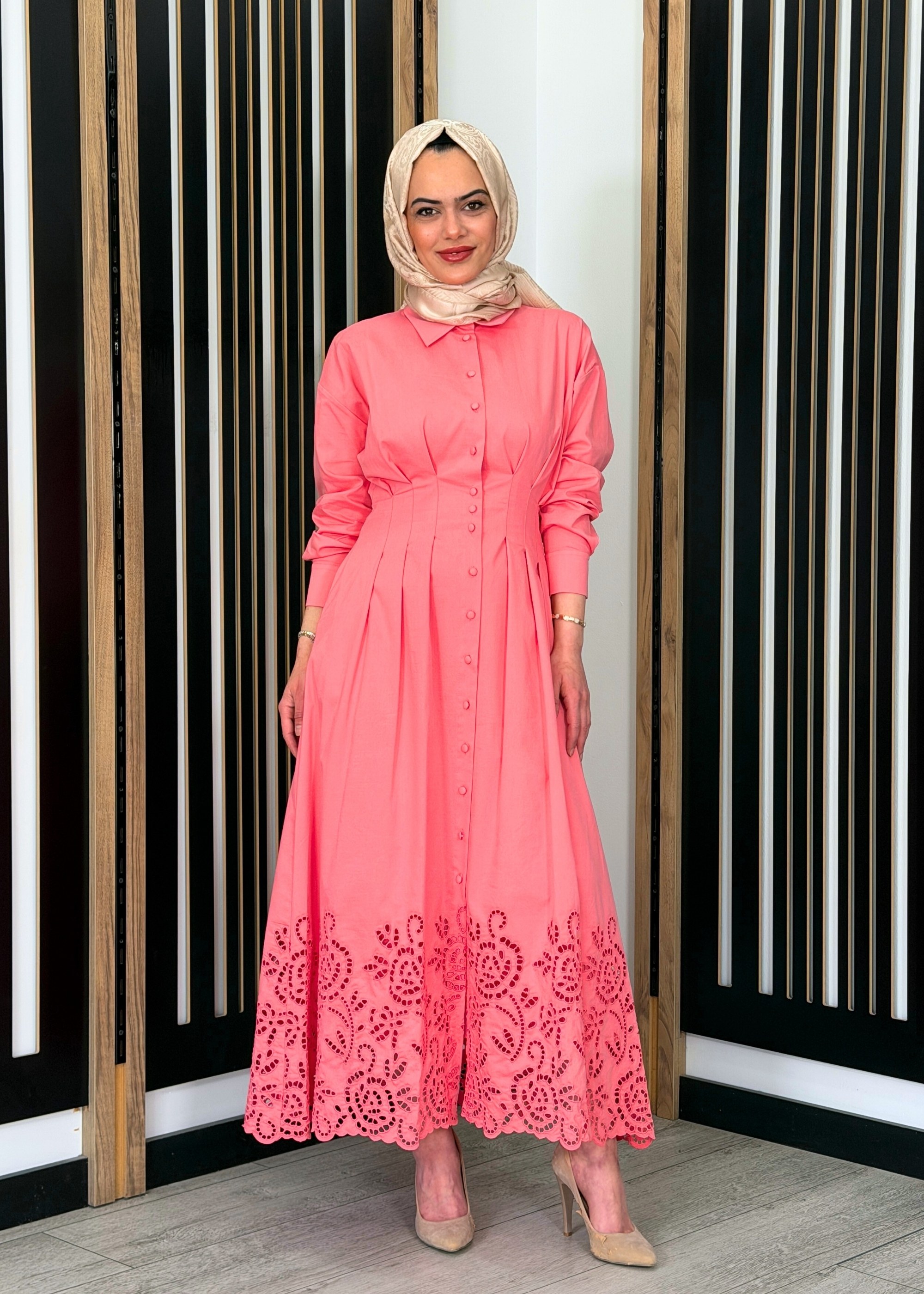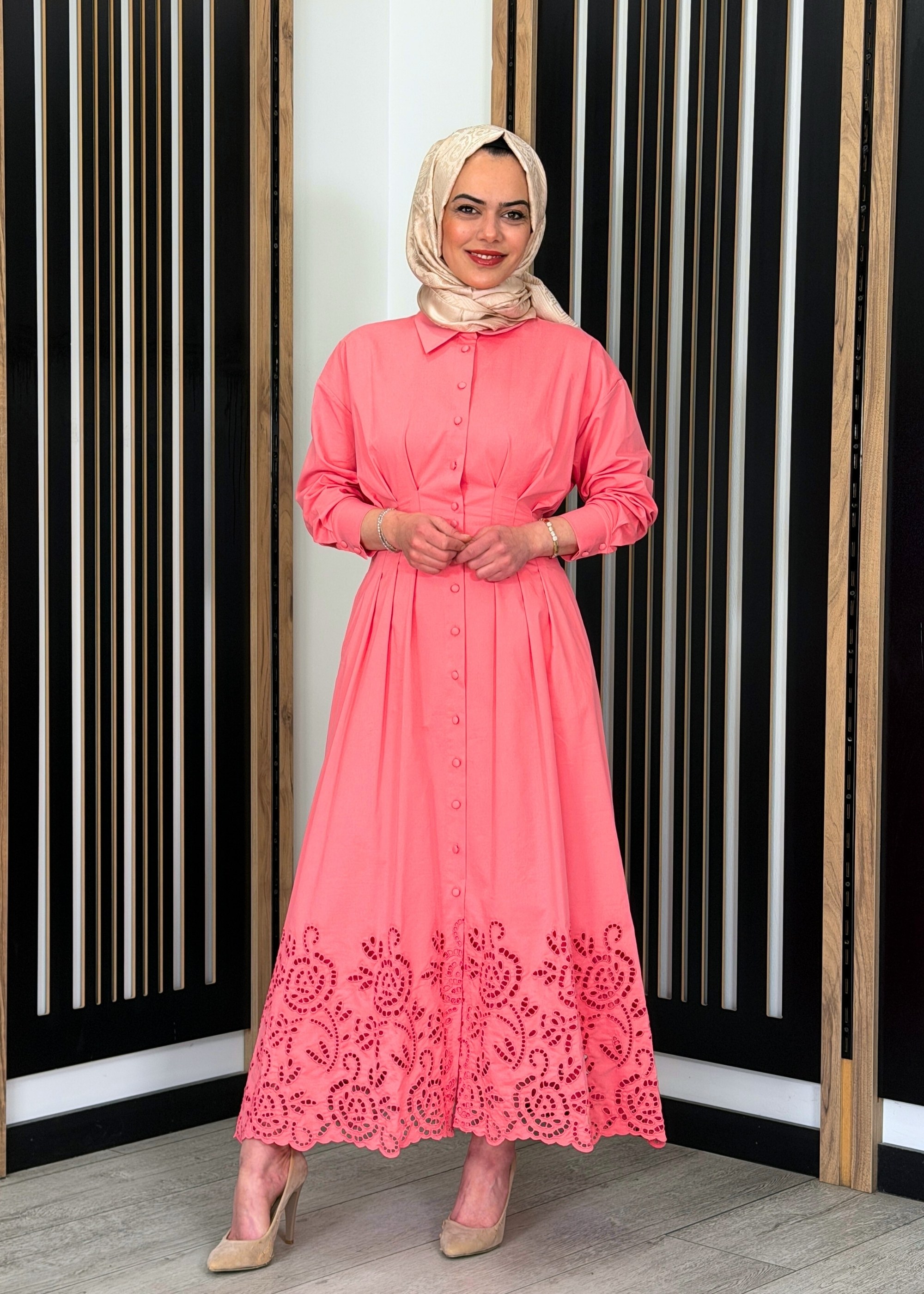 Zarif dantel detayları ve canlı rengiyle öne çıkan bu elbise, tesettür şıklığını romantik bir dokunuşla tamamlar. Günlük kullanımda enerjik bir stil sunarken, özel günlerde de rahatlıkla tercih edilebilecek şık bir parçadır.