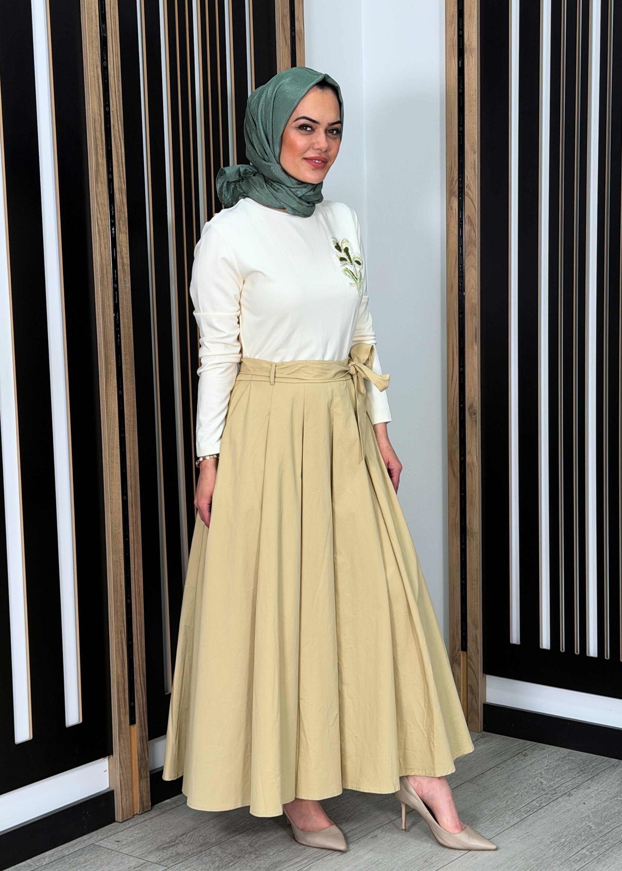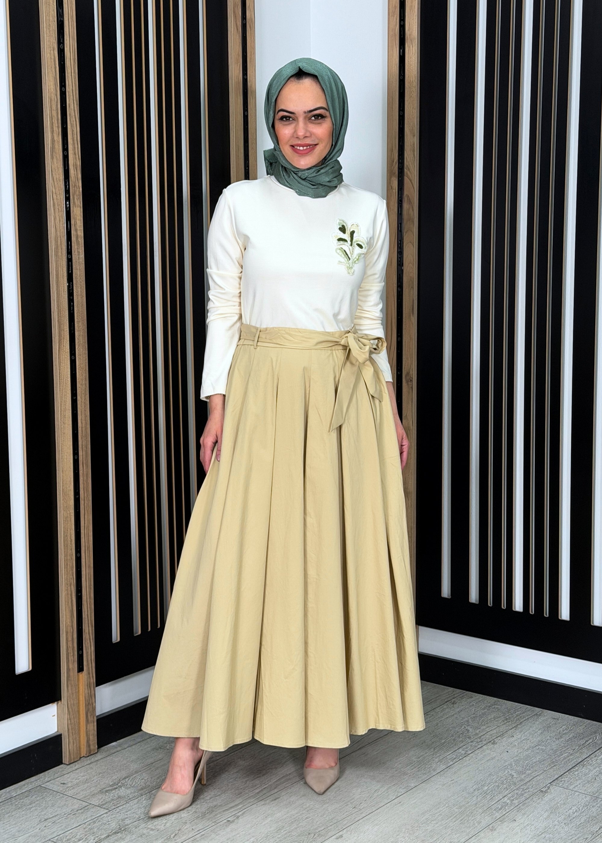 Bel kısmı form veren yapısıyla vücuda uyum sağlar, etek kısmındaki pileler sayesinde hareketli ve dökümlü bir siluet oluşturur. Rahat kalıbı ile konforlu bir kullanım sunar.