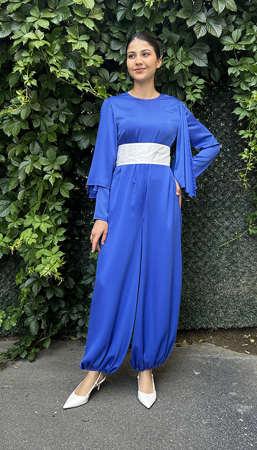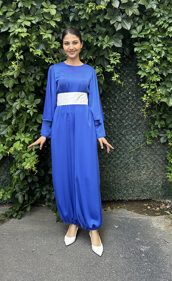 Kol kısmında parçalar vardır. Ayak bilek ucu lastiklidir. Saten kumaştır. Kumaş içerik: %100 Pes Ürün boy: 147cm 1 beden 36-38 2 beden 40-42 3 beden 42-44 bedene uyumludur.