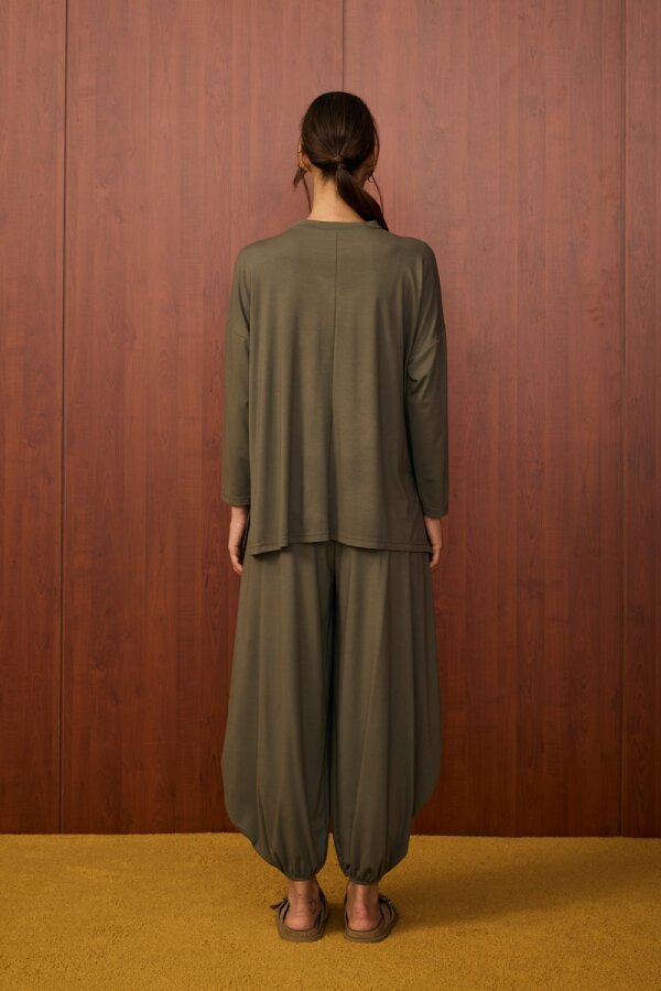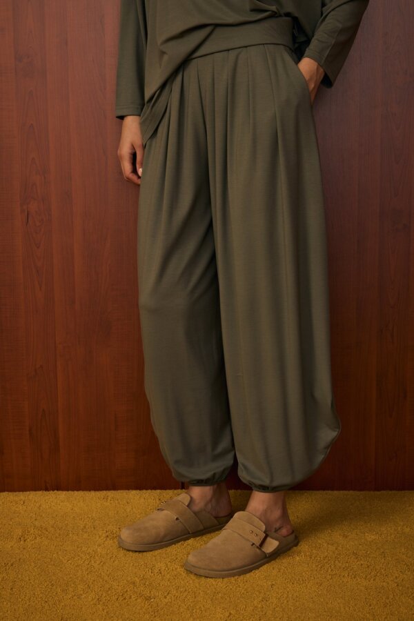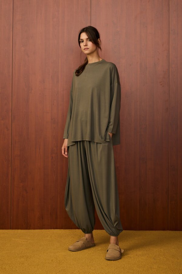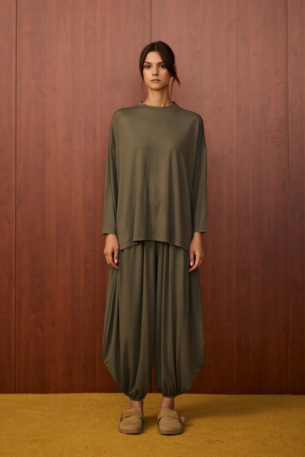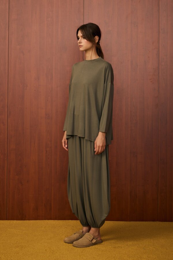 Alt parça bilek kısmı lastikli şalvar kesimdir.