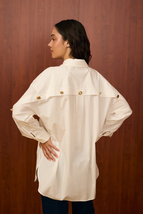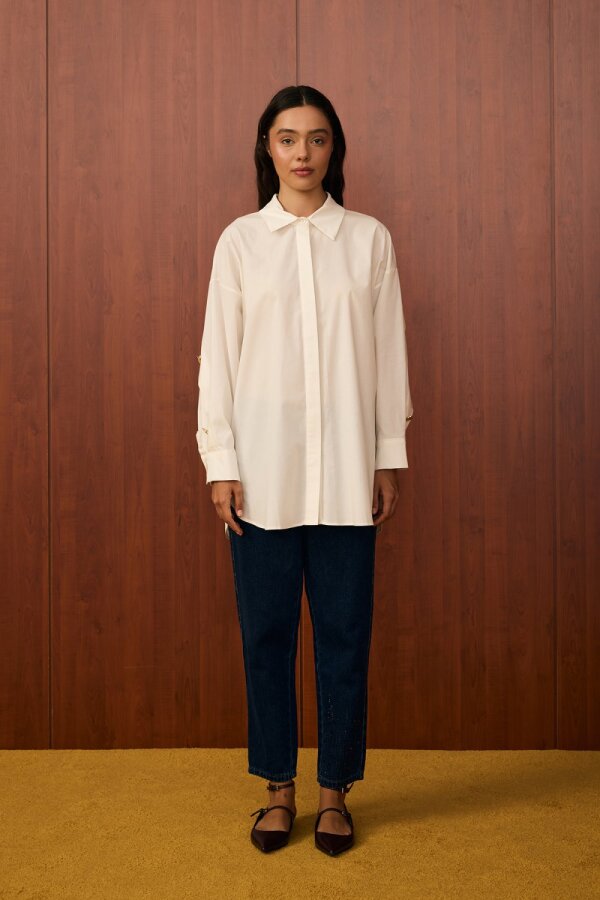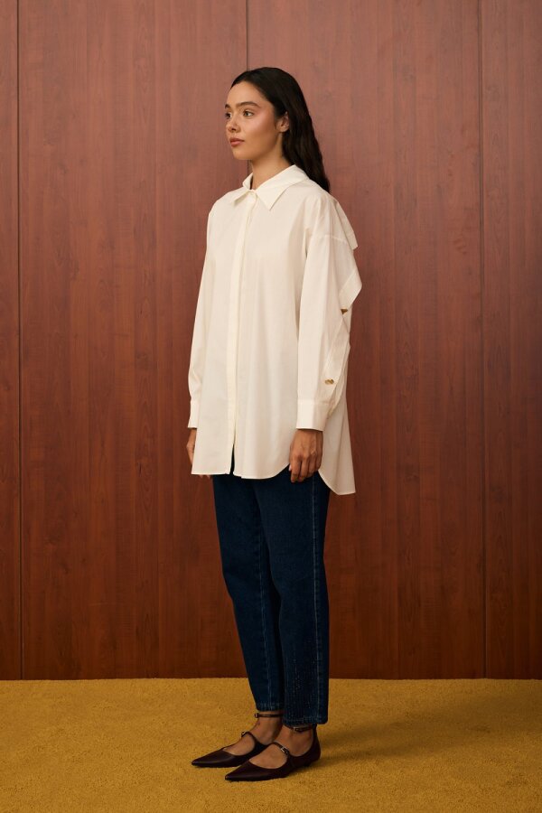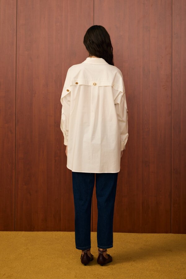 Kumaş Türü: Pamuk karışımlı poplin, ince dokuma kumaş. Hafif tok, dayanıklı ve rahat kullanımlıdır. Bedenleme: 1/2 şeklindedir. 1 Beden: 36/38/40 2 Beden: 42/44 Manken Bilgisi: Manken boyu 175 cm, üzerindeki beden 1’dir. Ürün Ölçüsü: Ön Boy: 70 cm Arka Boy: 73 cm Model Detayı: Düz kesim, kuşaklı, uzun kollu gömlek tasarımı. Geniş yaka detayı ve bele oturtulabilen kuşak ile şık ve modern bir görünüm sunar.