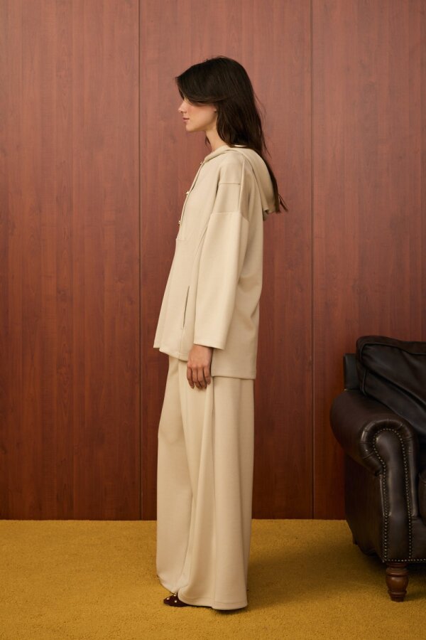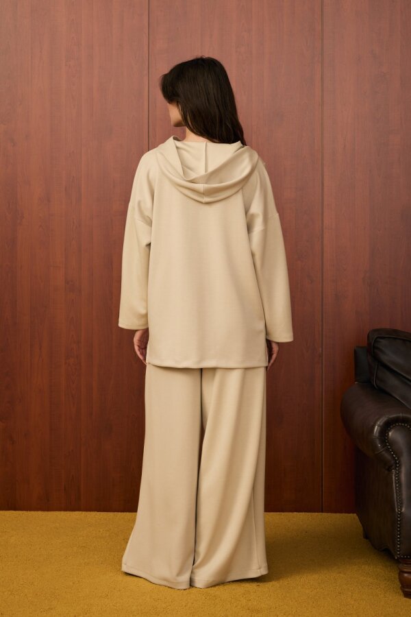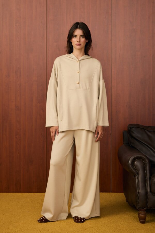 Ürün Özellikleri: Kumaş: İthal Modal Tunik Ön Boy: 72 cm Tunik Arka Boy: 75 cm Pantolon Boy: 100 cm Bedenleme: 1/2 Detaylar: Gold düğme detaylı kapüşonlu tunik, geniş paçalı pantolon Bu özel tasarım takım, hem rahatlığı hem de sofistike bir görünümü bir araya getiriyor. Yumuşak dokulu kumaşı sayesinde gün boyu kendinizi iyi hissedeceksiniz. Düşük omuzlu, salaş kesim tuniğin kapüşonunda yer alan gold düğme detayları, tasarıma modern ve şık bir dokunuş katıyor. Geniş paçalı pantolonu ise hareket özgürlüğü sunarken, modern bir siluet oluşturuyor. Önü kısa, arkası uzun kesimiyle farklılık yaratan bu takım, gardırobunuzun en sevilen parçalarından biri olacak.