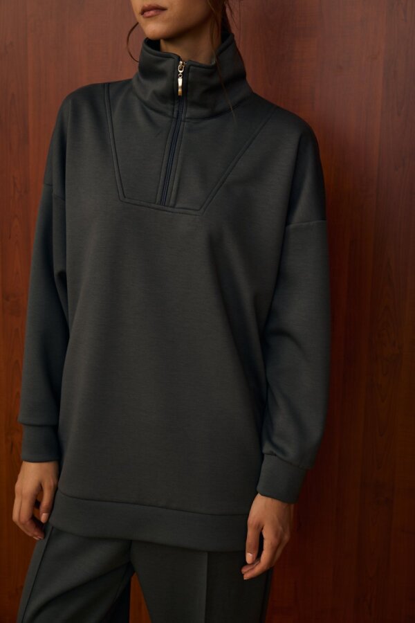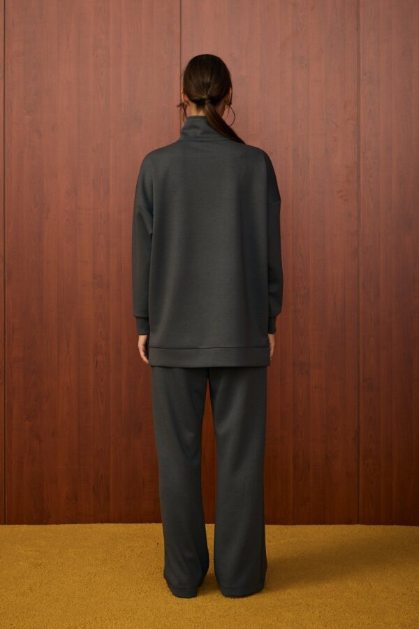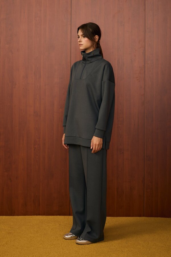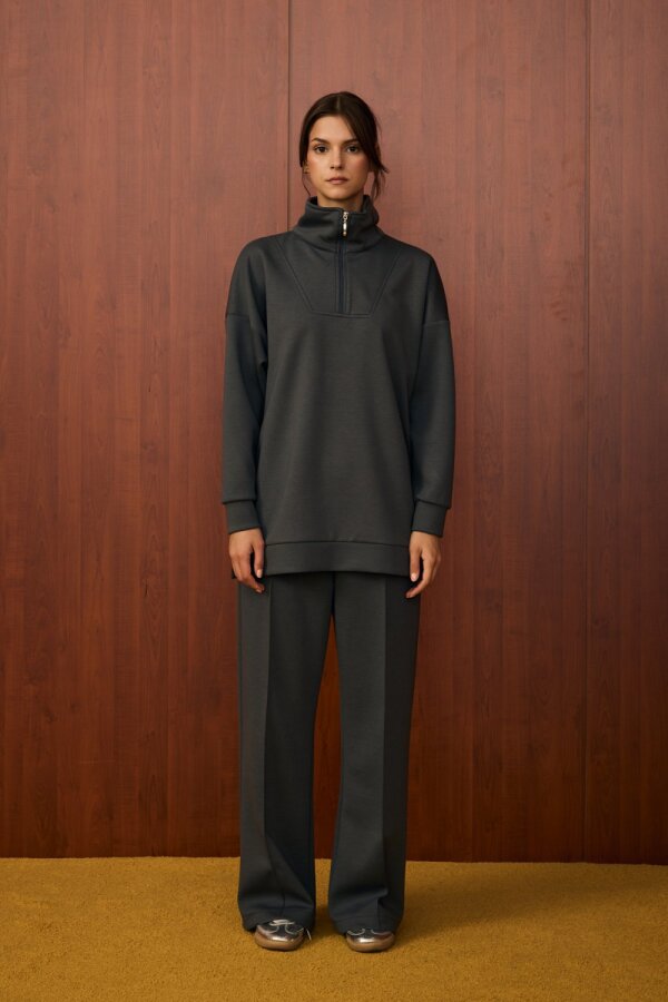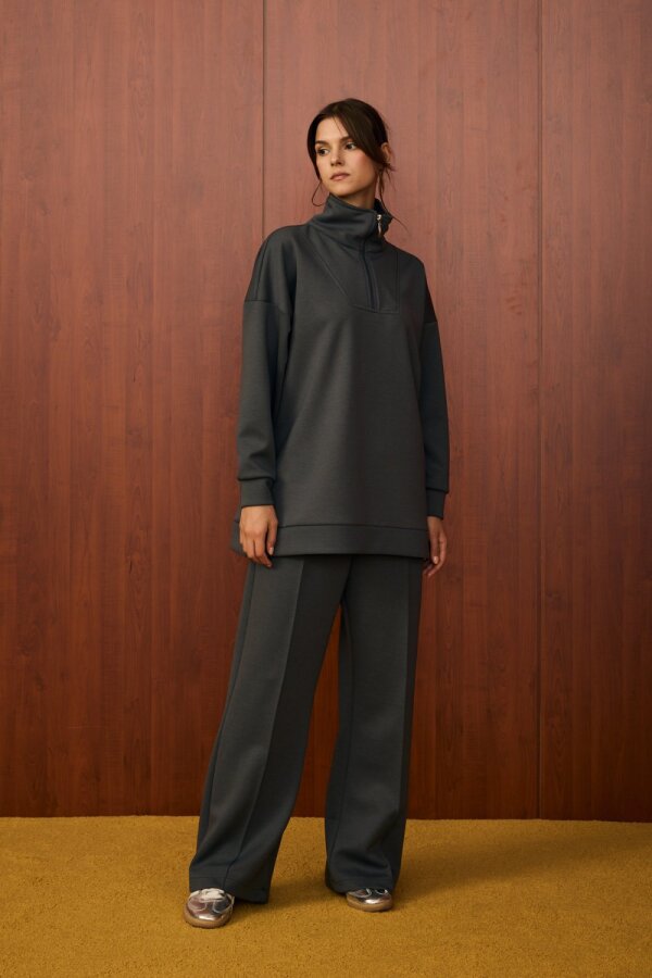 Ürün Özellikleri: Model Türü: İki parçalı spor-şık takım (üst + pantolon) Kumaş & Tasarım: Kumaş Yapısı: Orta kalınlıkta, rahat ve dökümlü kumaş İki İplik Yaka Detayı: Yarım fermuarlı, dik yaka Form: Oversize rahat kesim Tarz: Günlük kullanıma uygun spor-şık tasarım Ölçüler: Üst Parça: Ön Boy: 74 cm Arka Boy: 76 cm Alt Parça (Pantolon): Boy: 105 cm Bedenleme: 1/2 şeklindedir: 1 Beden: 36 / 38 / 40 2 Beden: 42 / 44 Manken Bilgisi: Boy: 175 cm Giydiği Beden: 1 Beden