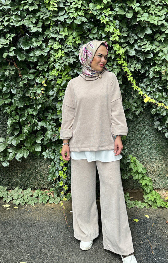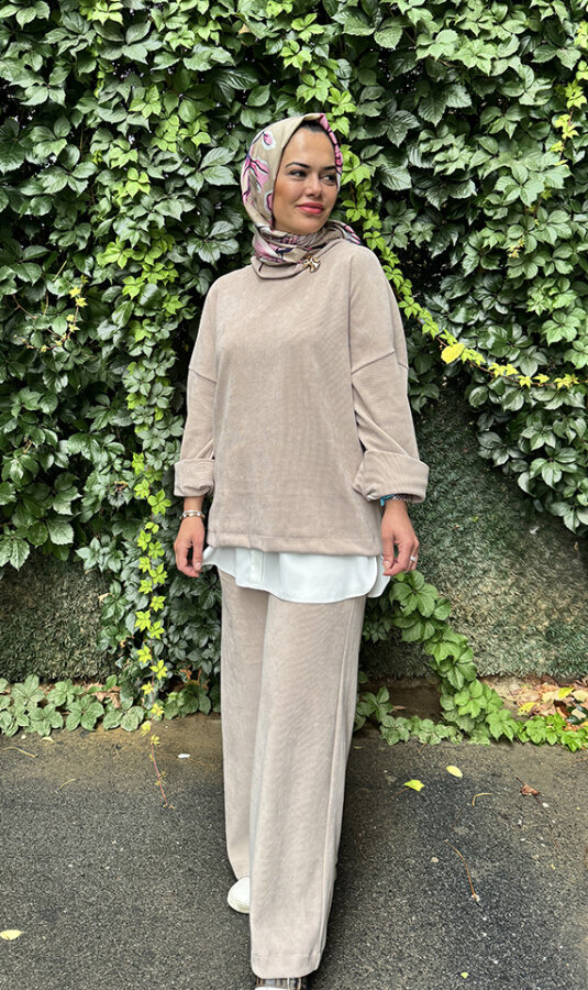 İki parçadan oluşan bu takım, hem şıklığı hem rahatlığı bir arada sunar. Üst parça salaş kesimli ve geniş manşet detaylıdır. Alt parça ise rahat kesimli bol paça pantolondur.