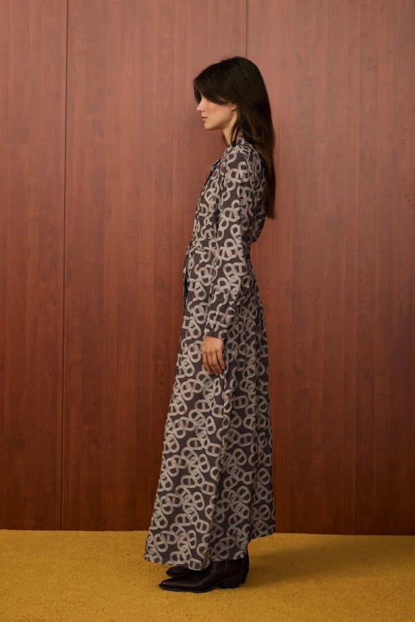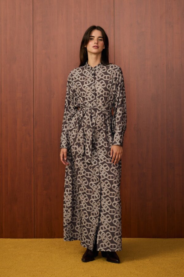 Modern ve zarif bir duruş sergilemek isteyen kadınlar için tasarlanan bu elbise, dolabınızın en özel parçalarından biri olacak. İthal krep kumaştan üretilen elbise, dökümlü ve rahat yapısıyla gün boyu konfor sunar. Benzersiz zincir deseni, tasarıma dinamik ve sofistike bir hava katıyor. Klasik gömlek yaka detayı, önü boyunca uzanan düğmeleri ve belden oturtmalı kemer detayı ile vücudunuza zarif bir form kazandırabilirsiniz. Astarı sayesinde iç göstermez, bu sayede daha rahat bir kullanım sağlar.