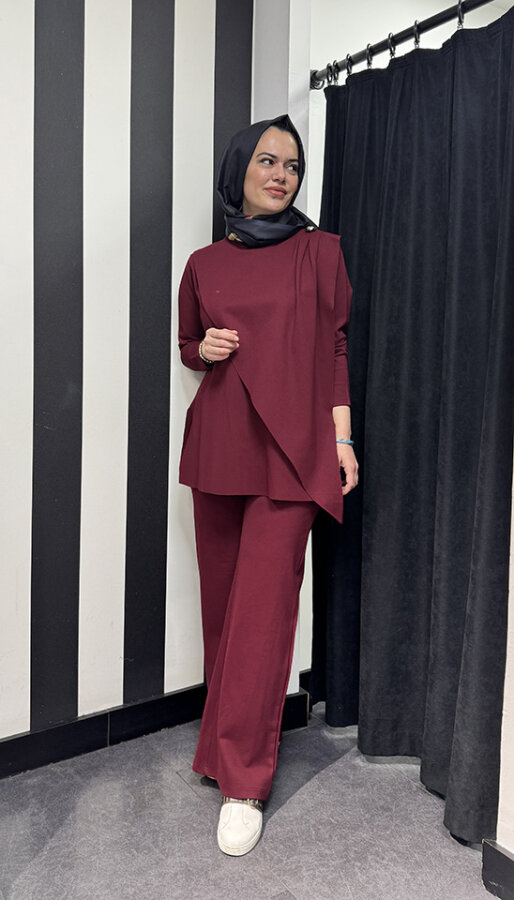 Ürün Kumaş: İnterlok Ürün Üst Boy: 77 cm Ürün Alt Boy: 102 cm Bedenleme: 1/2 şeklindedir 1 Beden: 36/38/40 2 Beden: 42/44 Manken Ölçüsü: 175 cm Manken Bedeni: 1 Beden Ürün Detayı: Boğazı kapalı, modern bir yaka kesimi mevcuttur. Üst parça asimetrik kesime sahip olup, omuz kısmında dekoratif metal düğme detayı bulunmaktadır. Pantolon düz paçalı ve geniş kesimlidir, rahat kalıptadır. Takım, hem günlük kullanım hem de şık kombinler için uygundur.
