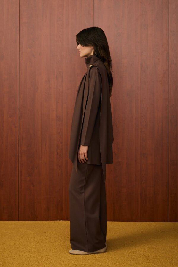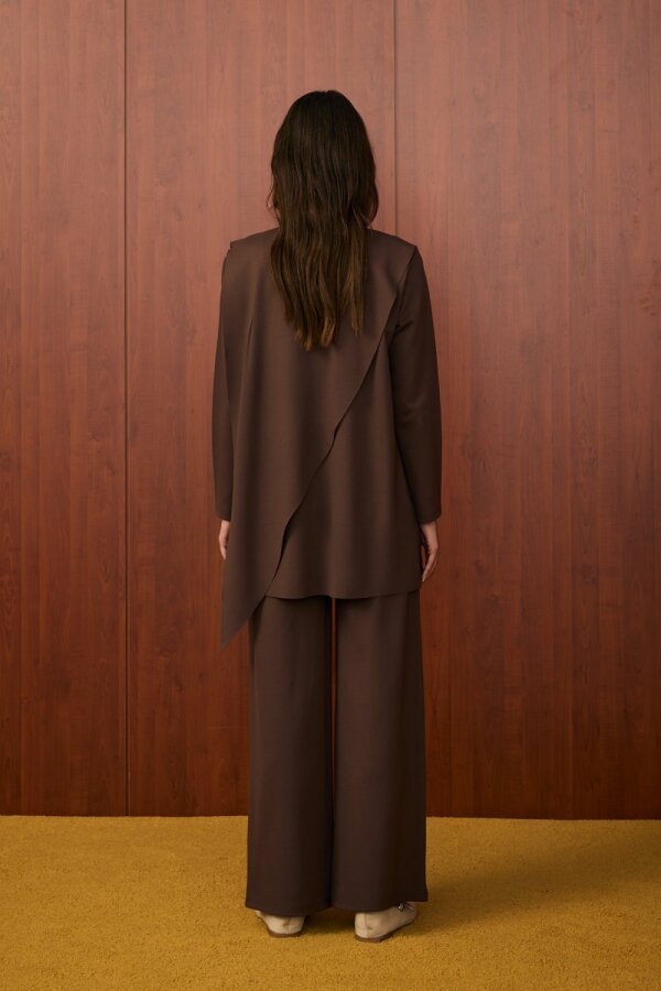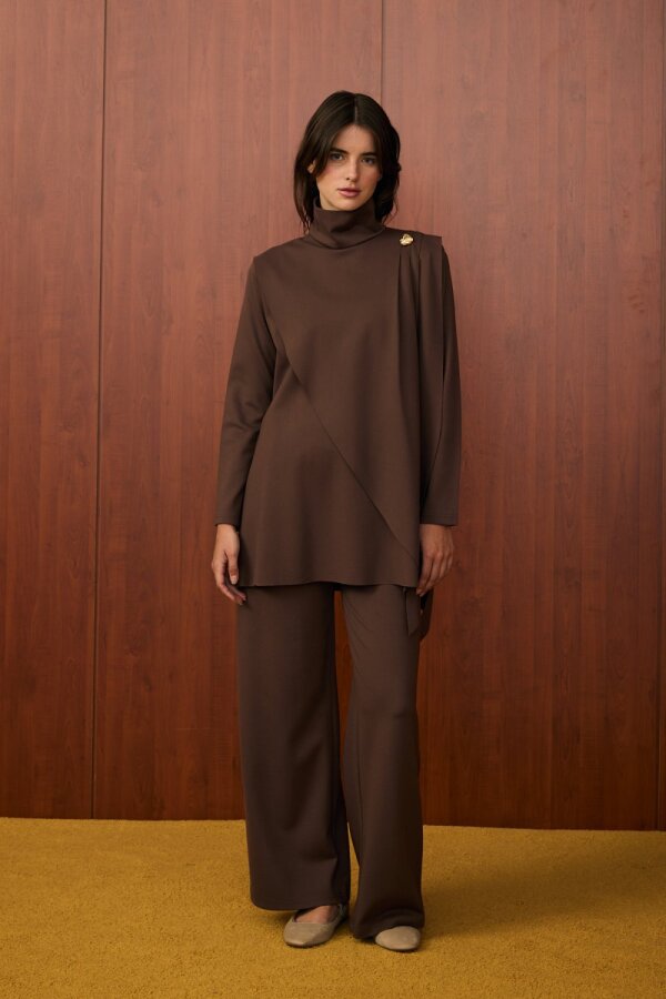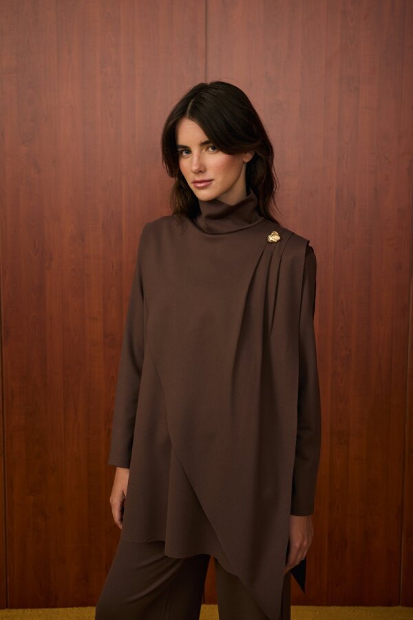 Üst parça asimetrik kesime sahip olup, omuz kısmında dekoratif metal düğme detayı bulunmaktadır.