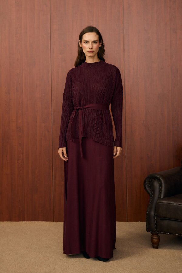 Ürün, simli dokusu sayesinde ışıltılı ve şık bir görünüme sahiptir. Üst parça uzun kollu ve bele oturan bir seyyar kuşakla tamamlanmıştır. Alt etek ise düz kesim ve uzun yapısıyla rahat kullanım sunar. Takım, hem günlük şıklıkta hem de özel günlerde tercih edilebilecek modern bir tasarıma sahiptir.