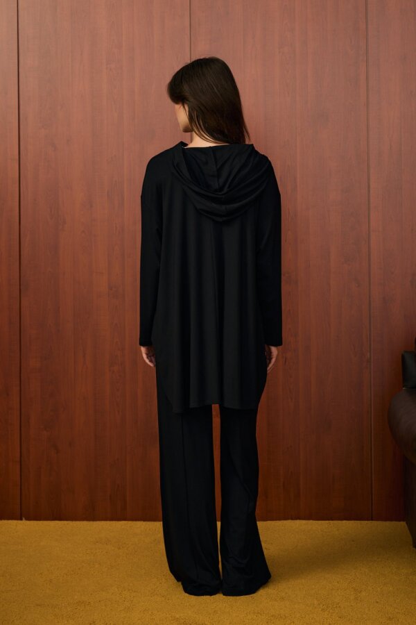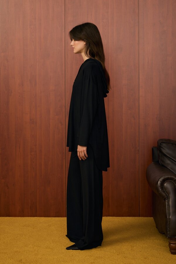 Konfor ve şıklığı bir araya getiren bu özel tasarım takım ile tanışın. Yumuşak ve dökümlü bambu modal kumaşı sayesinde gün boyu kendinizi iyi hissedeceksiniz. Tunik, önü kısa arkası uzun kesimi ve kapüşon altındaki zarif gold düğme detaylarıyla modern bir görünüm sunar. Beli lastikli ve geniş paçalı pantolonu, hareket özgürlüğü sağlarken şık bir duruş sergiler. Hem ev giyimi hem de günlük şıklık için ideal olan bu takım, gardırobunuzun vazgeçilmez parçalarından biri olacak.