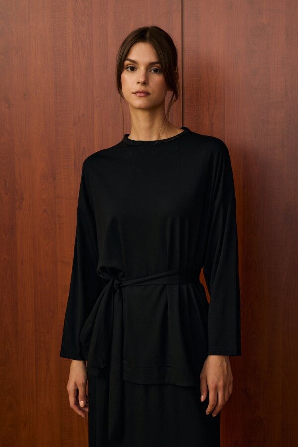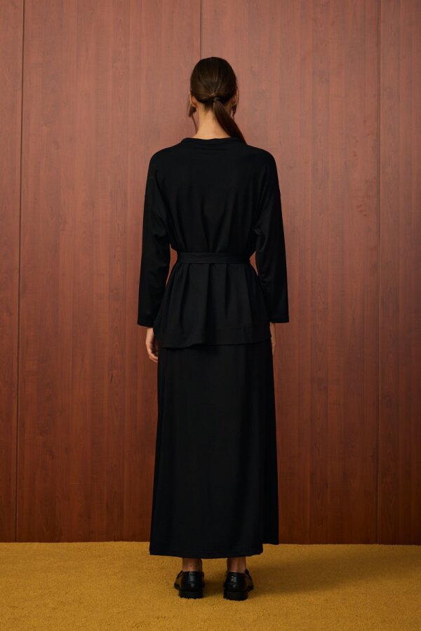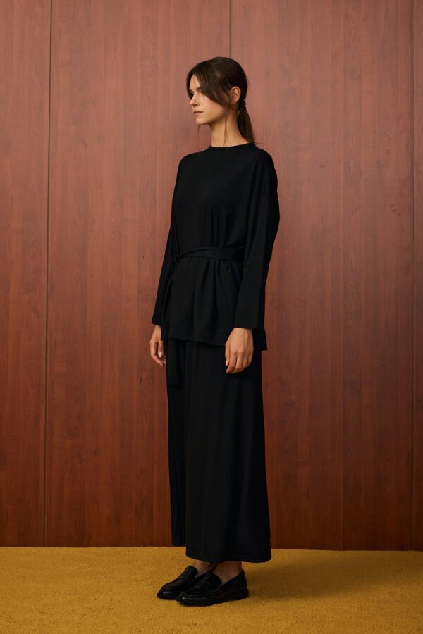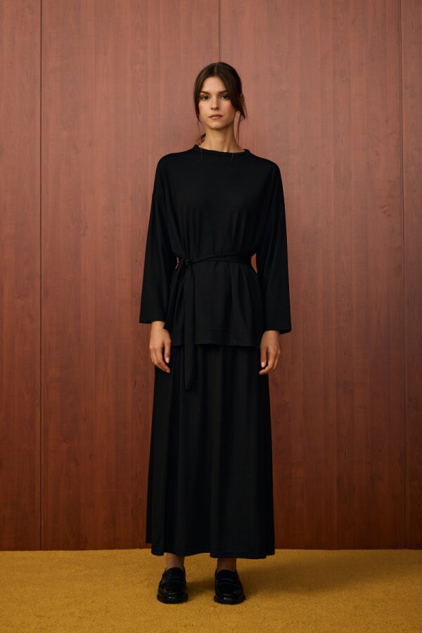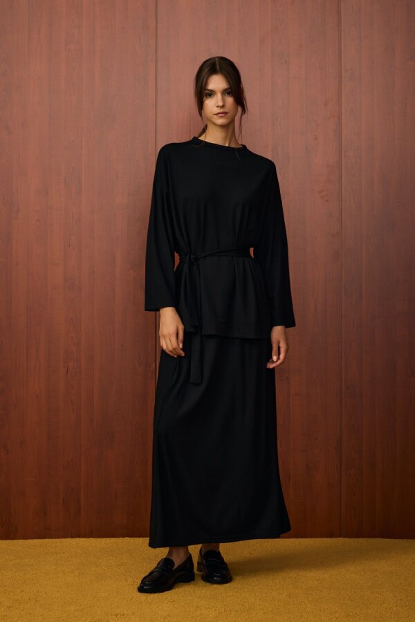 Ürün Özellikleri: Kumaş Türü: Modal Modal kumaş; yumuşak, hafif, nefes alabilir ve cilt dostudur. Günlük kullanımda yüksek konfor sağlar. Parça Ölçüleri: Üst Boy: 73 cm Alt Boy (Etek-pantolon): 93 cm Üst parça seyyar kuşaklıdır (kendi kumaşından kemerli) Model Detayı: Üst parça: Düz kesim, bisiklet yaka, uzun kollu ve rahat formda Alt parça: Geniş paçalı, etek görünümlü pantolon Minimal tarzı sayesinde hem ev içi hem dış giyim için uygundur Renk: Siyah Bedenleme: 1/2 şeklindedir 1 Beden: 36/38/40 2 Beden: 42/44