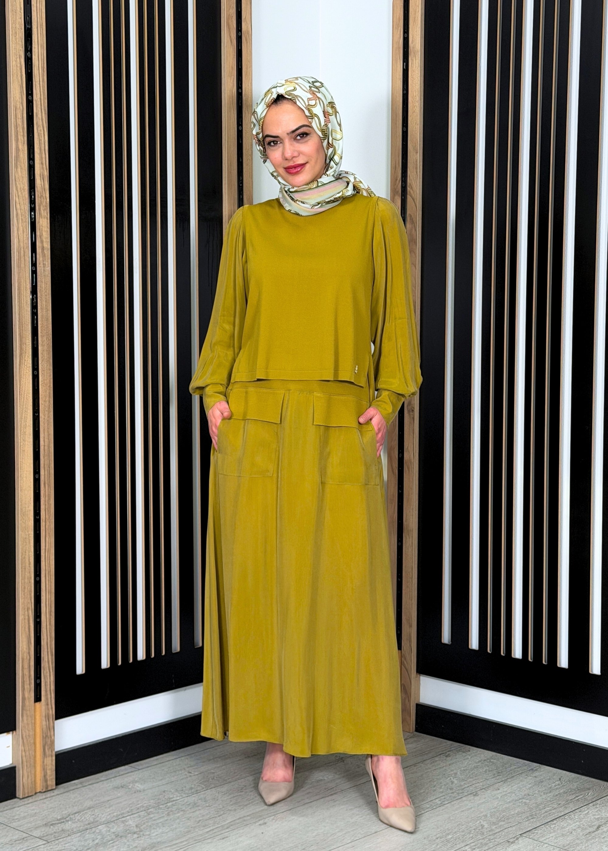 Aynı kumaştan bluz ile takım olarak kullanıldığında bütüncül ve sofistike bir görünüm elde edilir. Şık bir şal, minimal çanta ve topuklu ya da düz ayakkabılarla kombinlenerek hem günlük hem özel günlerde zarif bir stil oluşturulabilir. Studio Nish çizgisine uygun, zamansız ve güçlü bir parçadır.