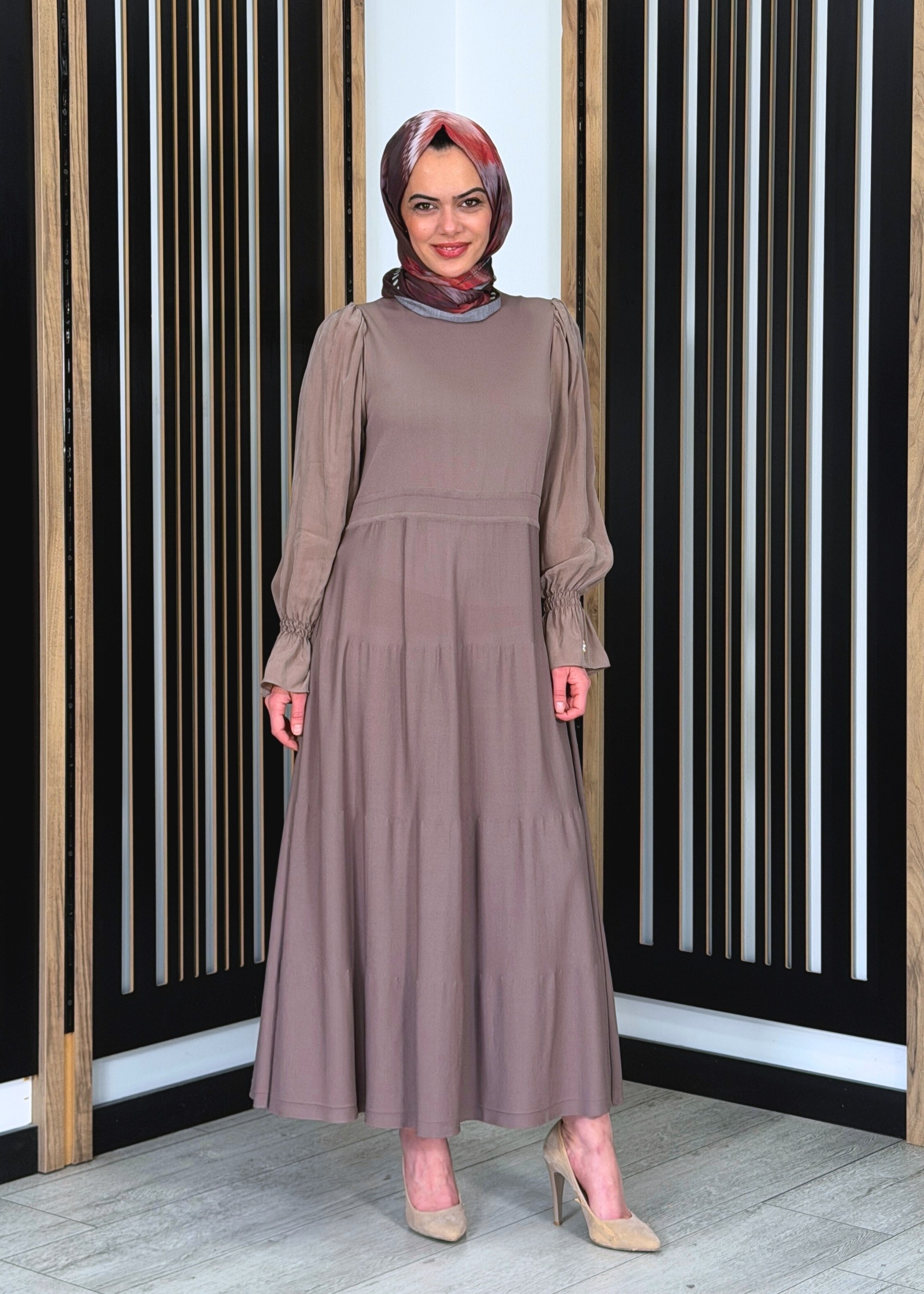 Rahat ve dökümlü kalıba sahiptir. Vücuda yapışmayan kesimi sayesinde akışkan ve zarif bir duruş sunar. Uzun boyu ve pileli etek formu ile hareketli ve şık bir görünüm sağlar. Tesettür giyime uygun, konfor odaklı ve zarif bir kalıptır.