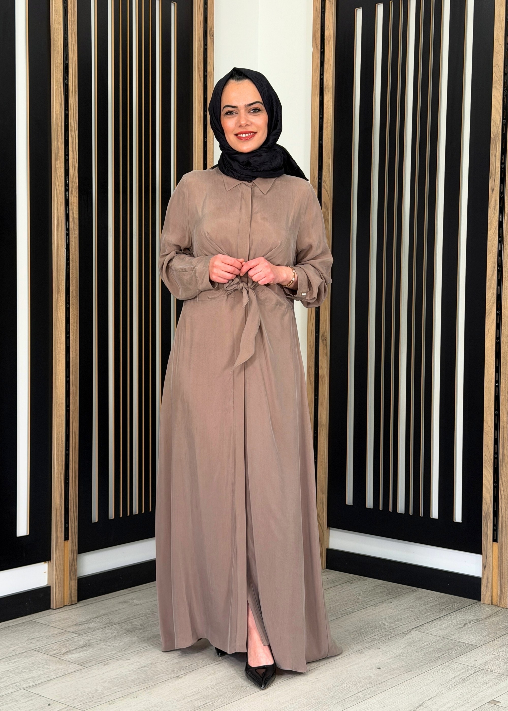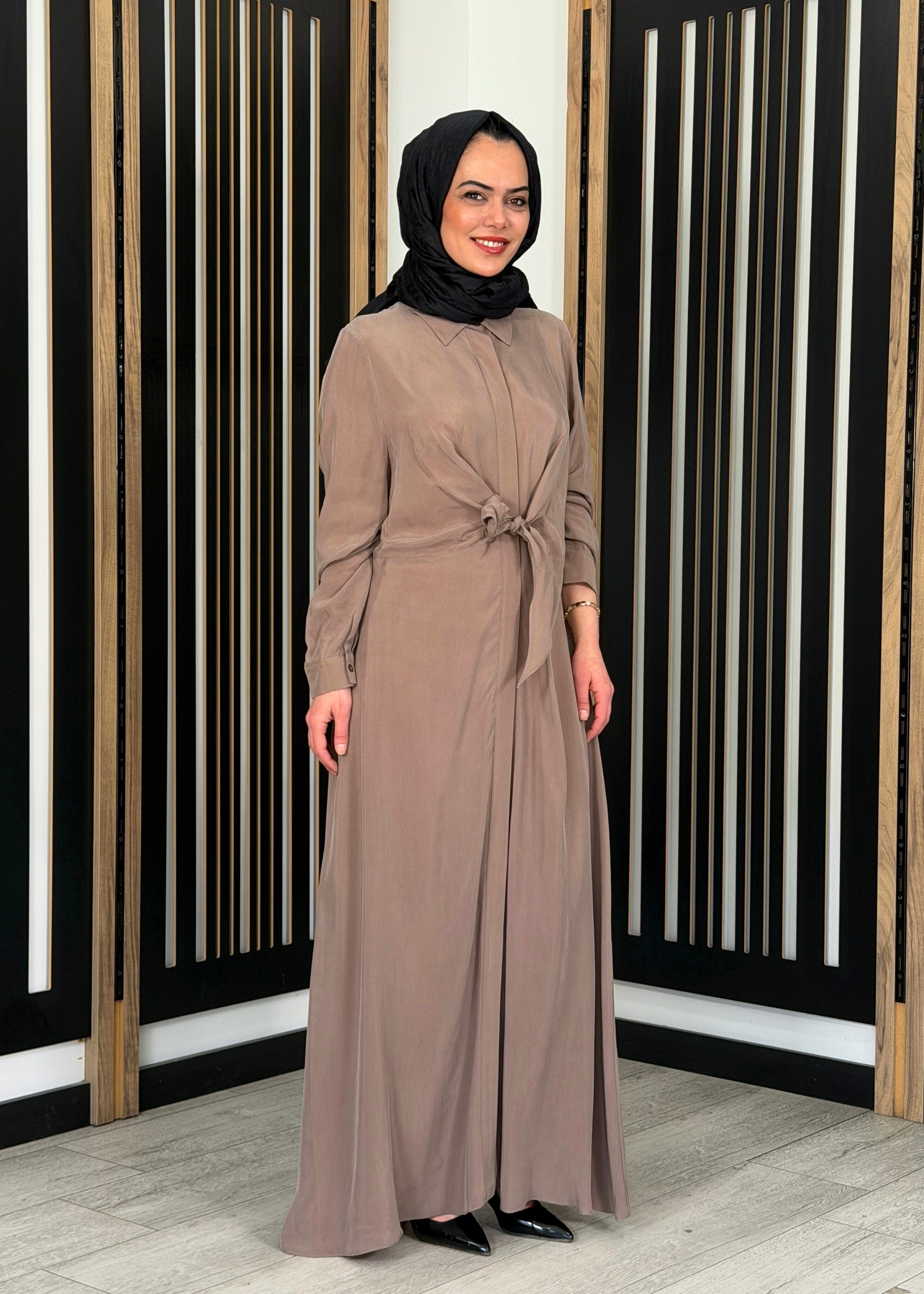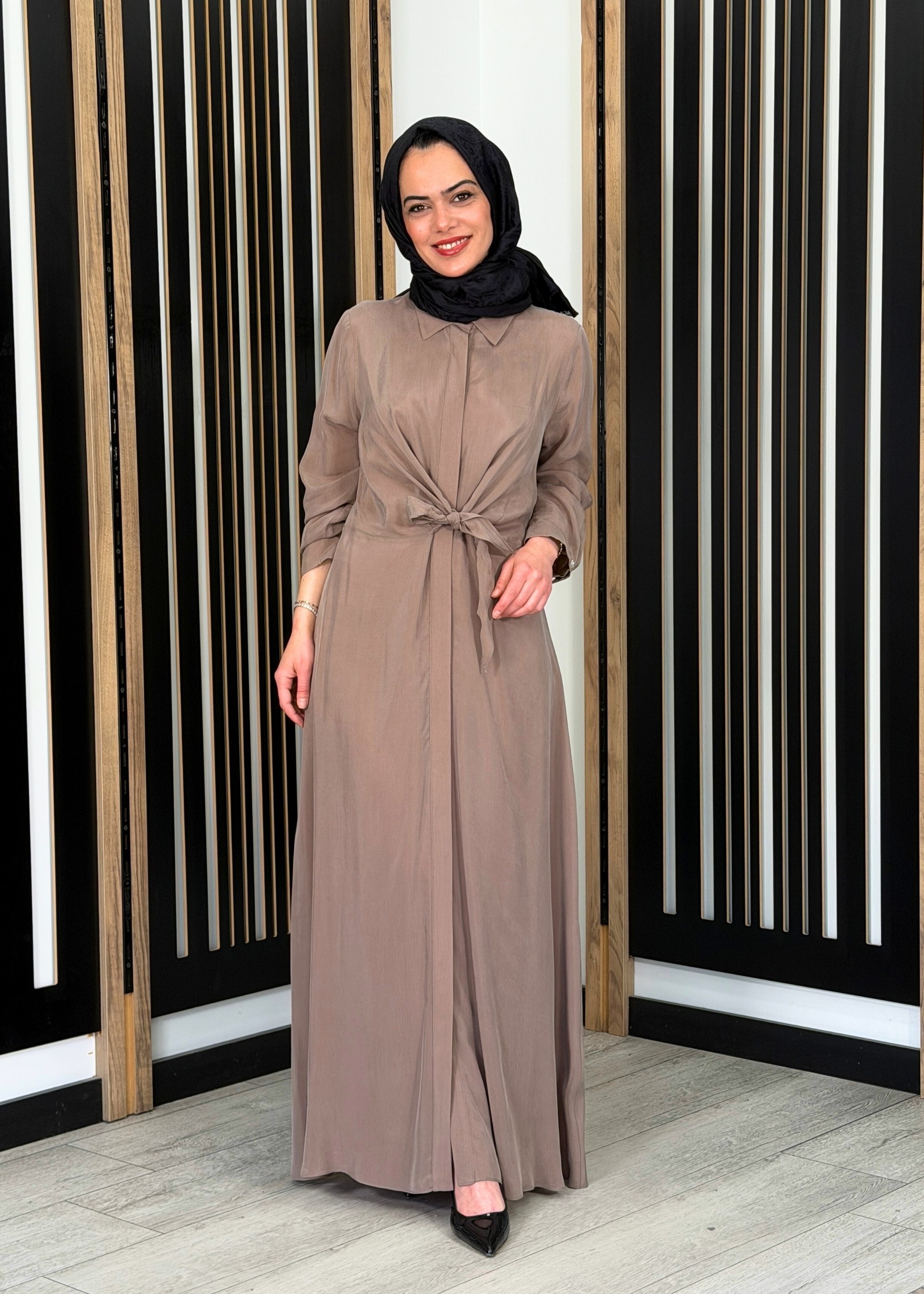 Hakim yaka formu ve önden düğmeli tasarımı ile klasik şıklık sunan elbise, bel kısmındaki bağlama detayı ile vücut hatlarına uyum sağlar ve zarif bir görünüm kazandırır. Rahat kalıbı sayesinde hareket özgürlüğü sunarken, uzun boy kesimi tesettür giyime uygun şık ve dengeli bir duruş sağlar. %100 cupro kumaş yapısı ile hafif, nefes alabilen ve cilt dostu bir kullanım sunar.