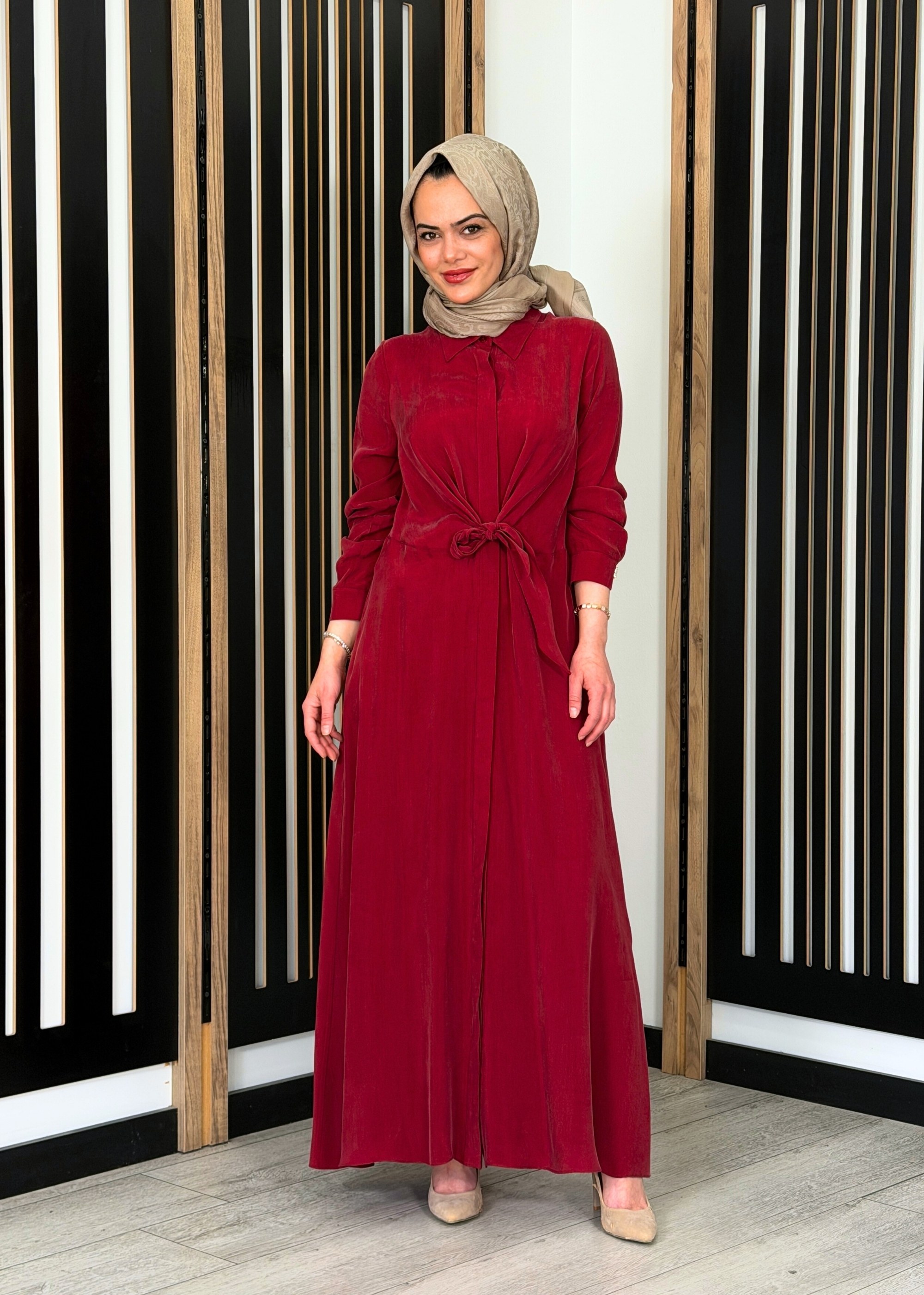 Hakim yaka formu ve önden düğmeli tasarımı ile klasik şıklık sunan elbise, bel kısmındaki bağlama detayı ile vücut hatlarına uyum sağlar ve zarif bir görünüm kazandırır. Rahat kalıbı sayesinde hareket özgürlüğü sunarken, uzun boy kesimi tesettür giyime uygun şık ve dengeli bir duruş sağlar. %100 cupro kumaş yapısı ile hafif, nefes alabilen ve cilt dostu bir kullanım sunar.