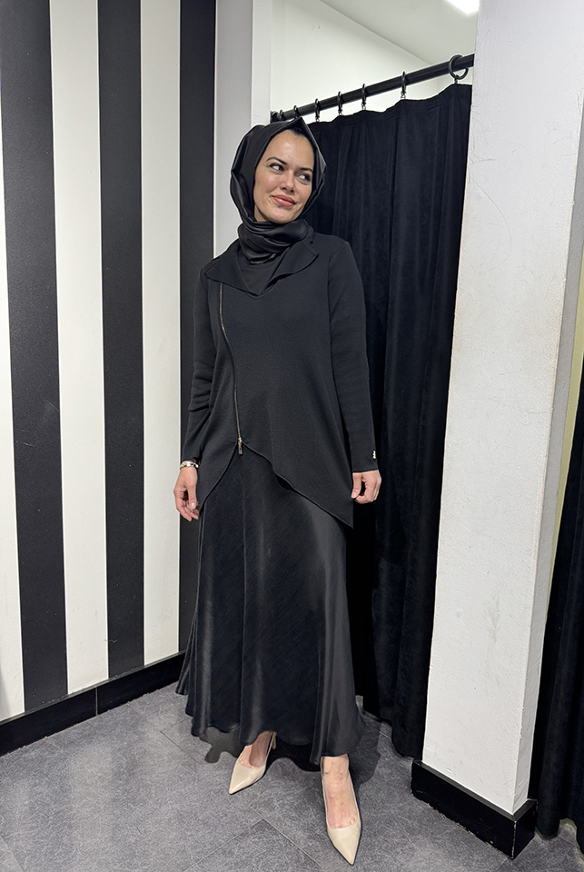Miss Dalida Önden Fermuarlı Asimetrik Kesim Hırka Takım BLACK