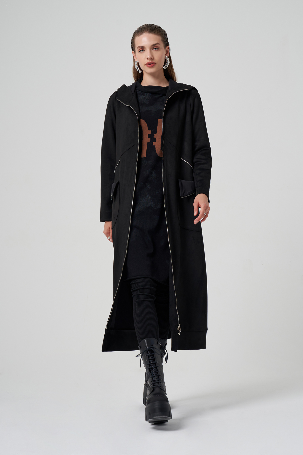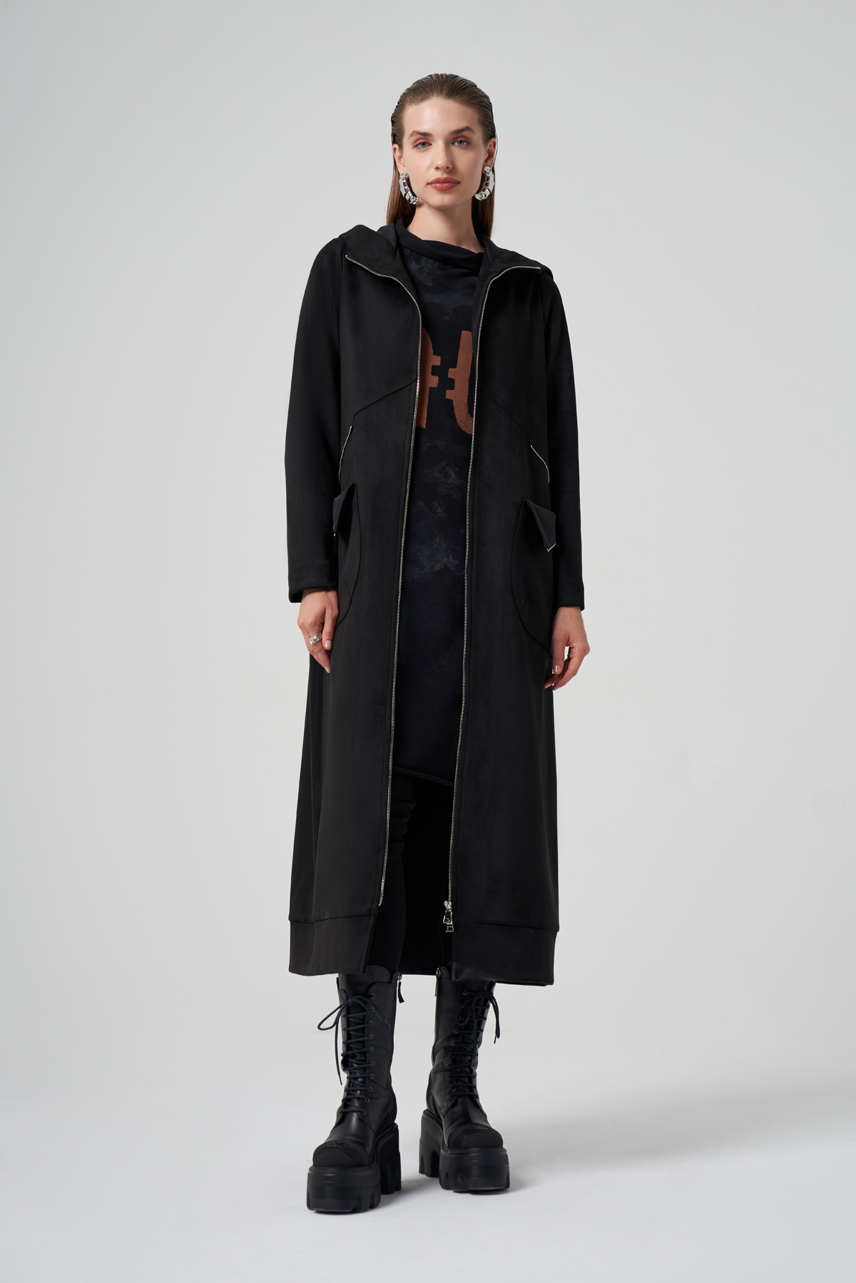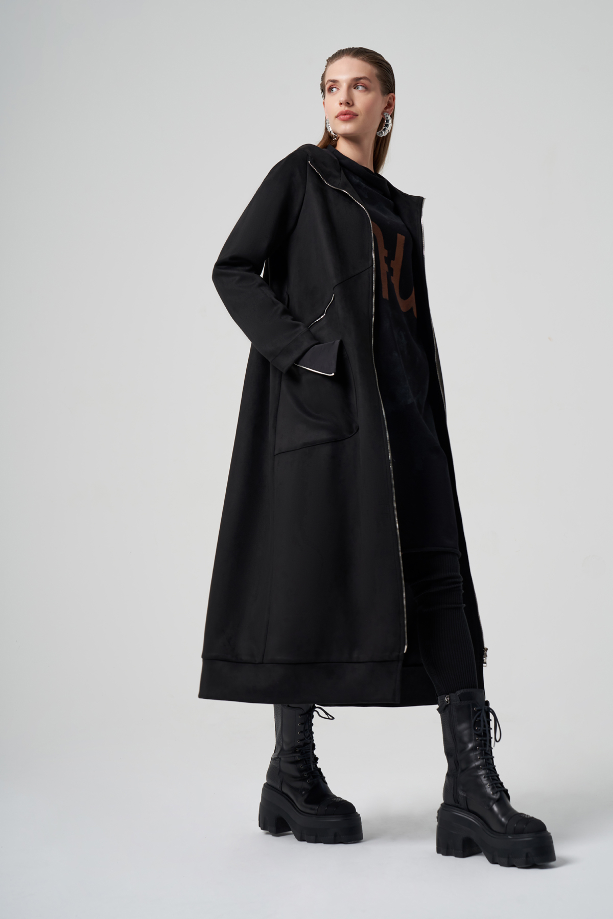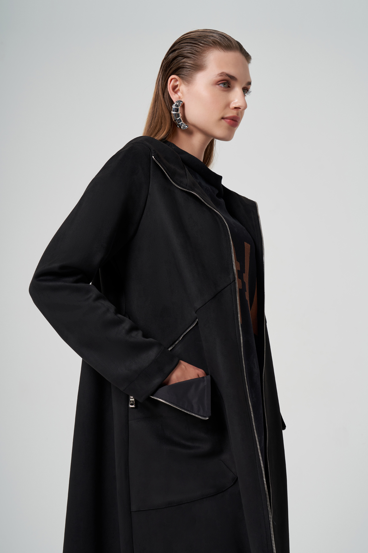 MissWhence Önden Fermuarlı Süet Pardesü SİYAH