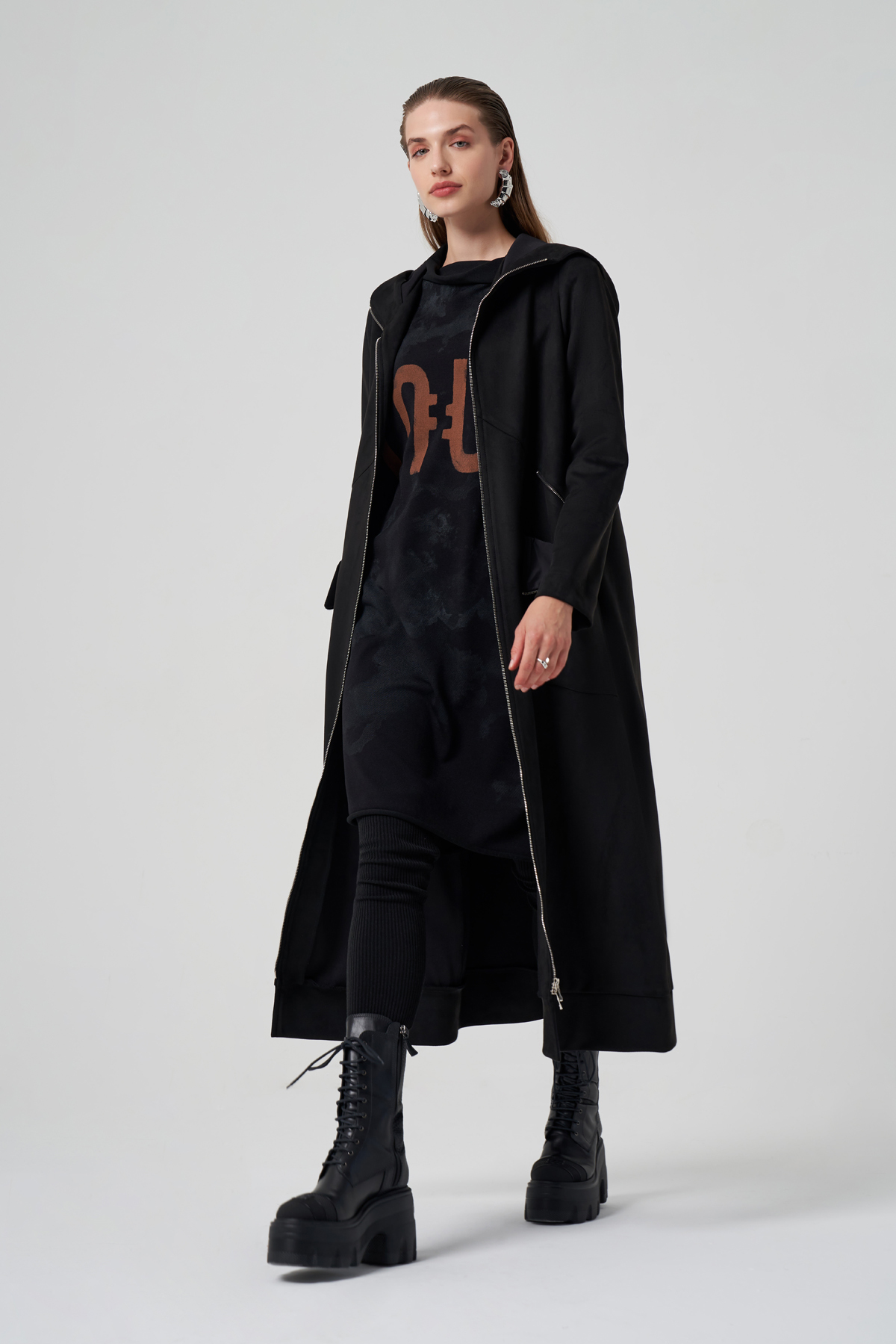 MissWhence Önü Fermuarlı Kapüşonlu İpek Pardesü SİYAH