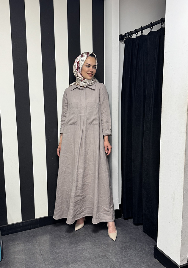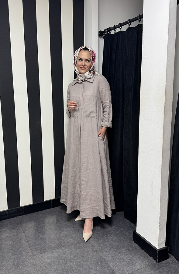 Düz renkli, uzun kollu bu gömlek elbise; keten kumaşın ferahlığını, sade tasarımın şıklığıyla birleştiriyor. Gömlek yaka detayı ve ön cep uygulamalarıyla hem işlevsel hem de şehir stiline uyum sağlayan bir duruş sergiliyor. Günlük konfor arayanlar için ideal bir parça.