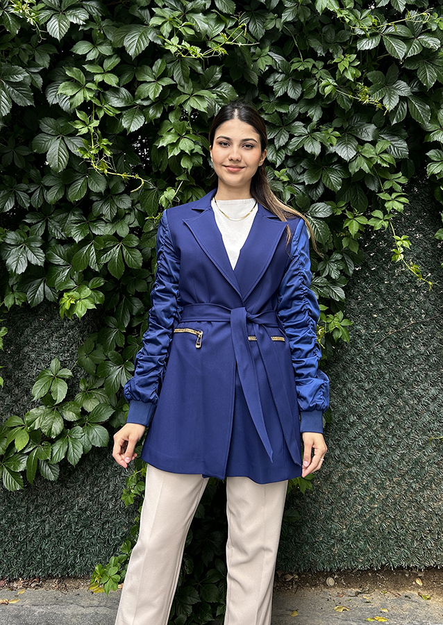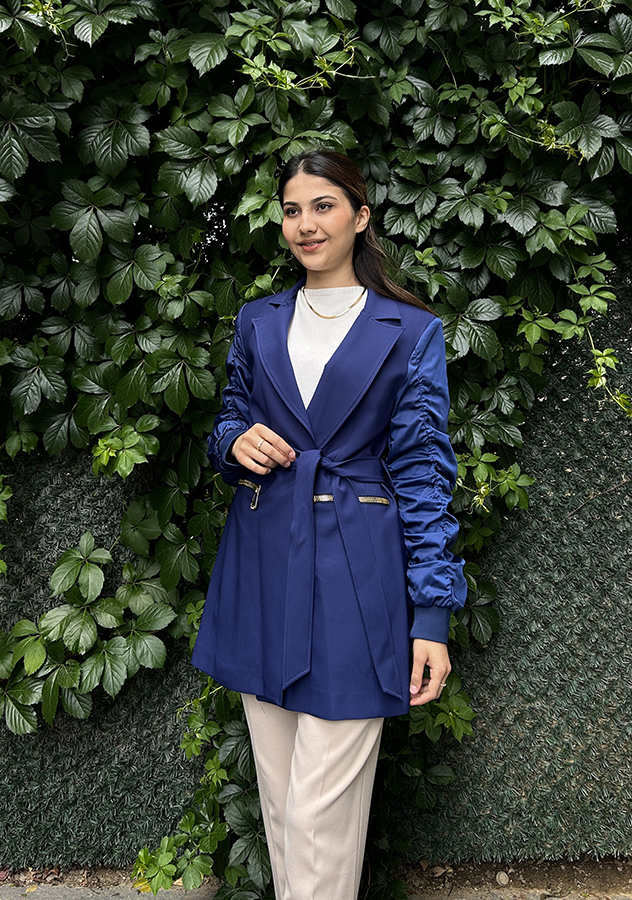 Ürün önü açıktır, ön kısımda bulunan fermuar detayları ceptir, vatkalıdır. Kollarında büzgü detayı vardır, kol ucu lastiklidir. Astarlıdır. Kumaş içerik: %88 Pes %12 EA Ürün boy: 80cm