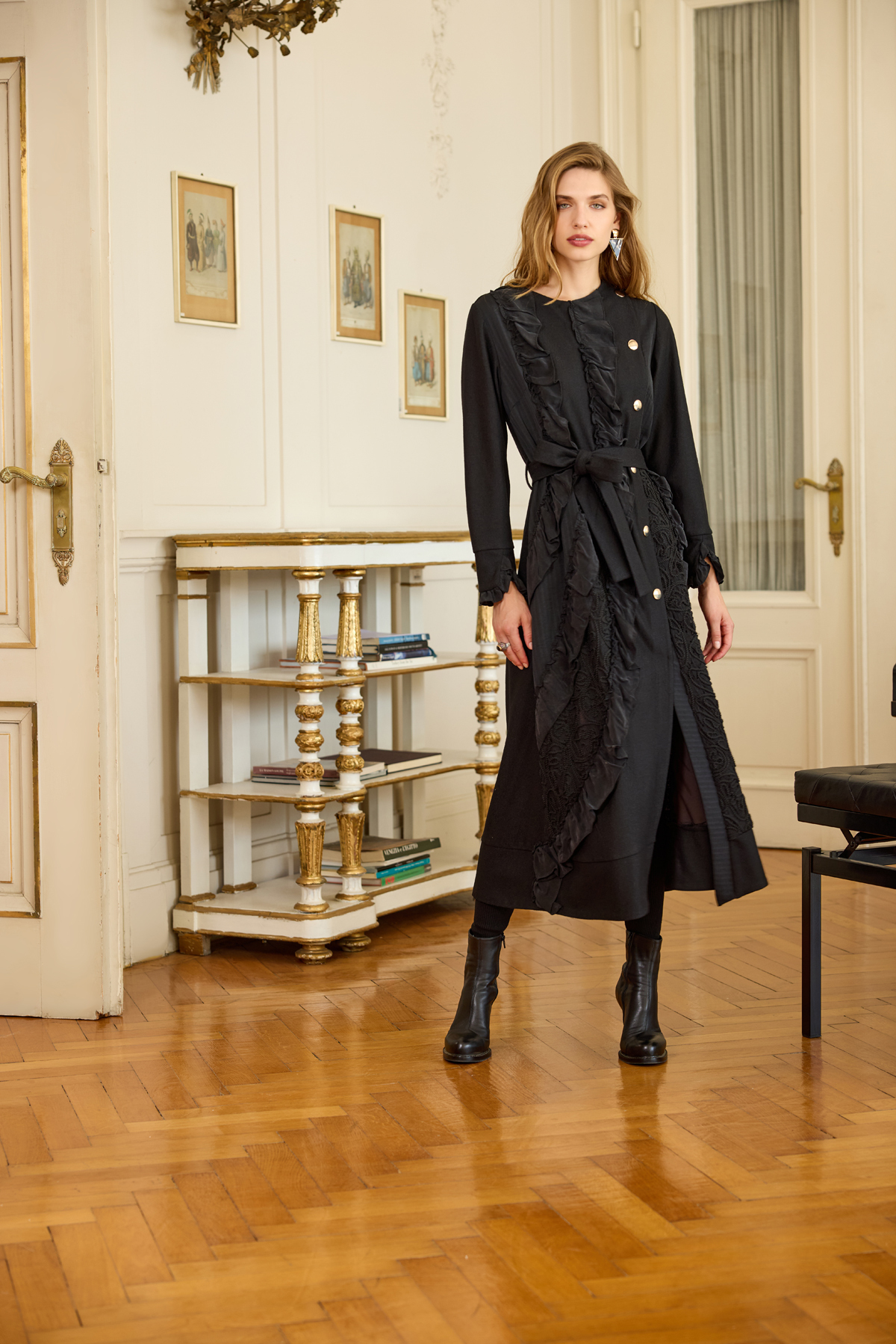 MissWhence Büyük Düğme Detaylı Brodeli Keçe Pardesü SİYAH