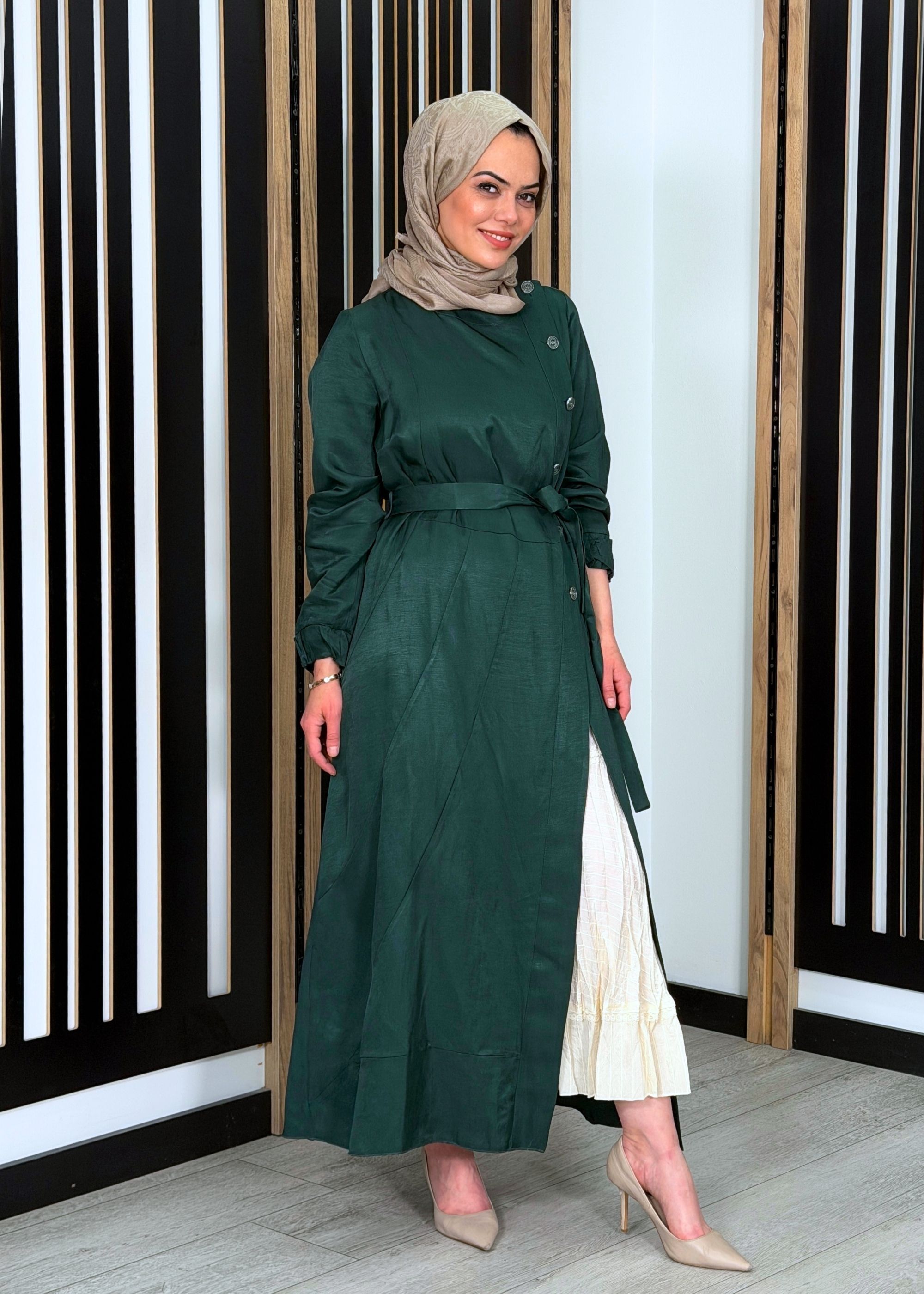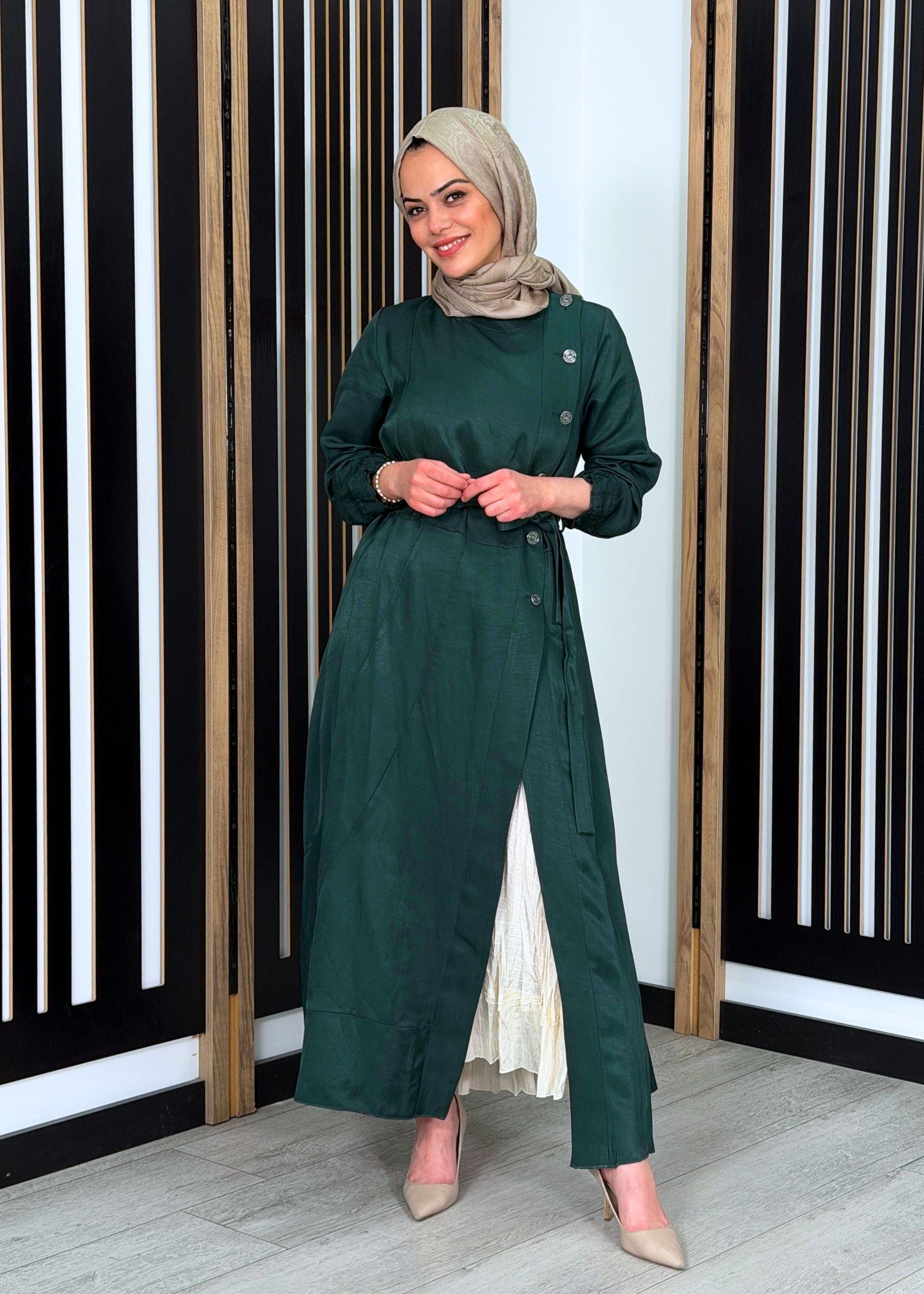 Zarif düğme detayları ve modern kesimiyle öne çıkan bu elbise, MissWhence dokunuşuyla tesettür giyimde şıklığı konforla buluşturur. Yan düğme detayı ve akışkan yapısı sayesinde hem günlük kullanımda hem de özel anlarda rahatlıkla tercih edilebilir. Zamansız tasarımı ile gardırobunuzun vazgeçilmez parçalarından biri olmaya adaydır.