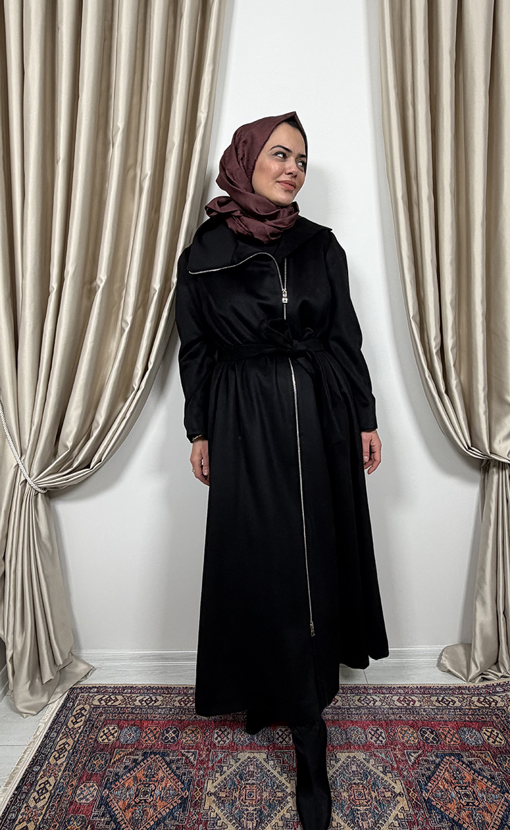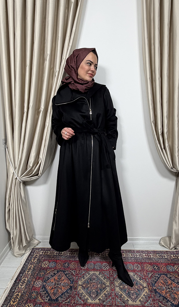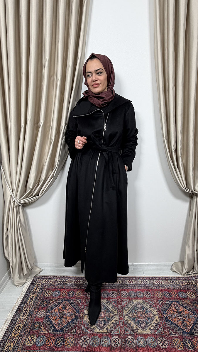 MissWhence Önü Fermuarlı Kapüşonlu İpek Pardesü SİYAH