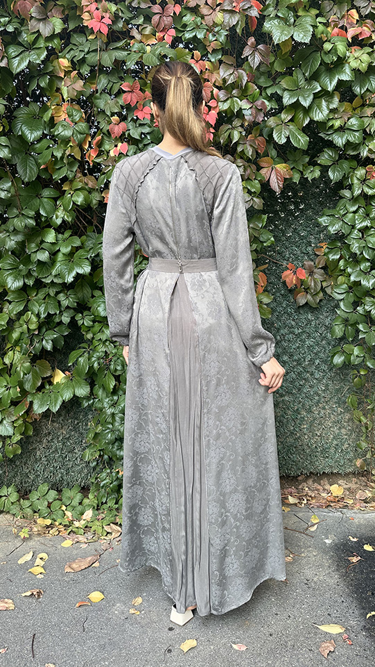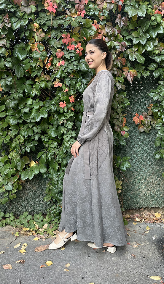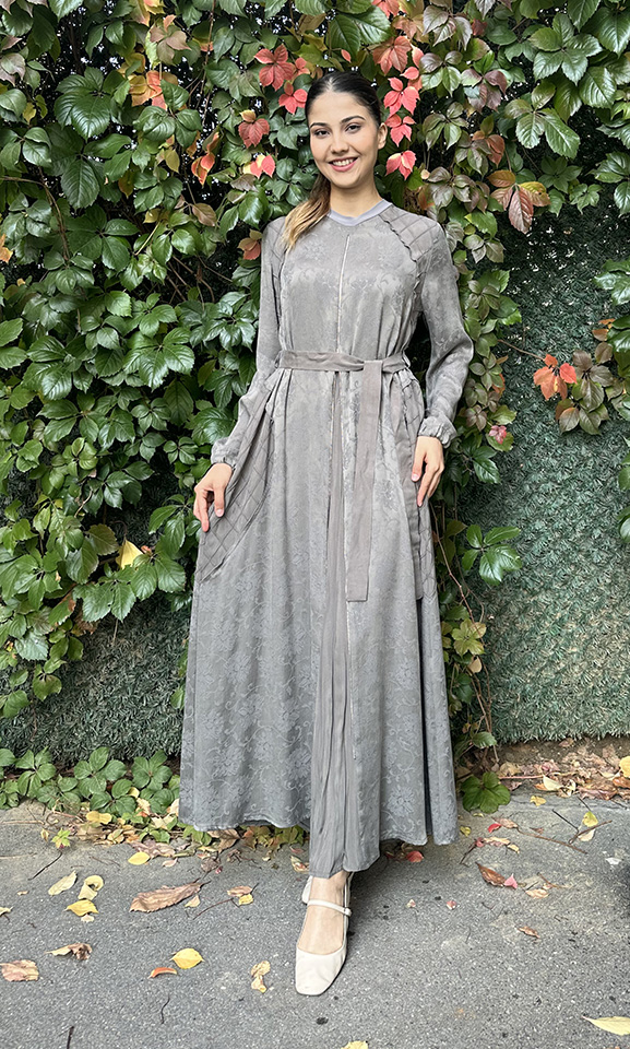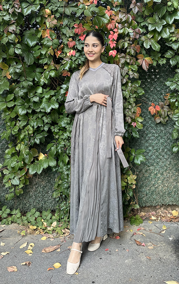 Yeşim Özcan Kolları Taş Detaylı Kat Kat Elbise GRİ