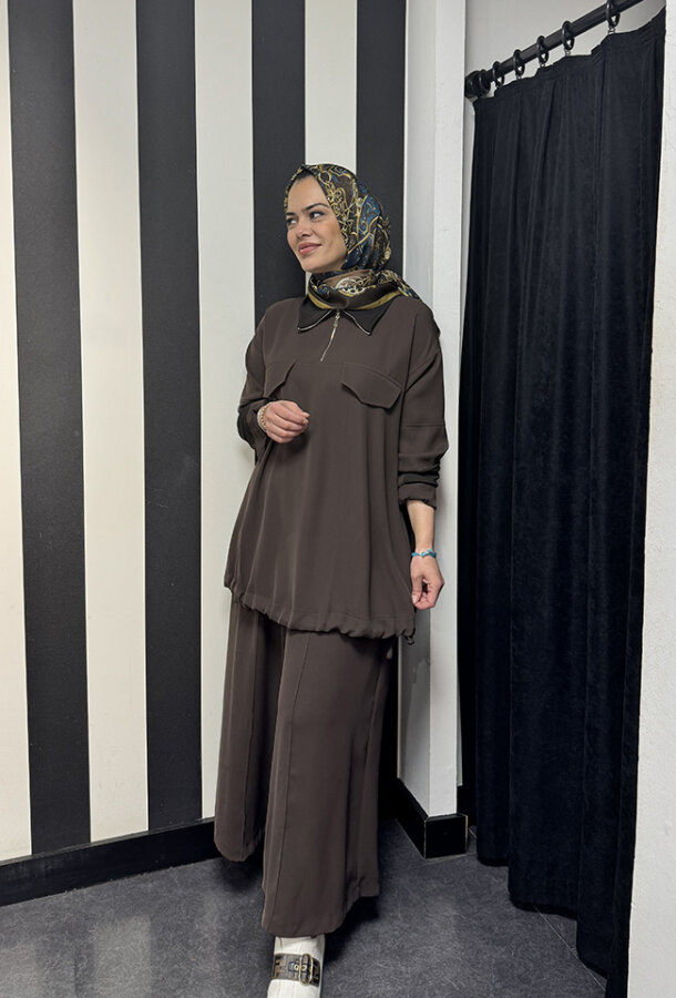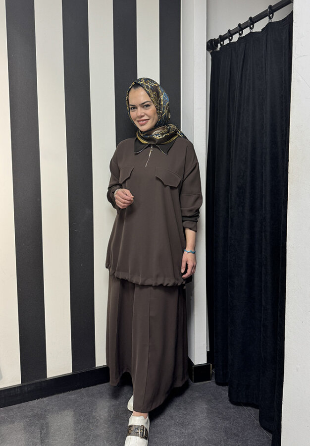 StudioNish Yakası Fermuarlı Pantolonlu Takım Acı Kahve