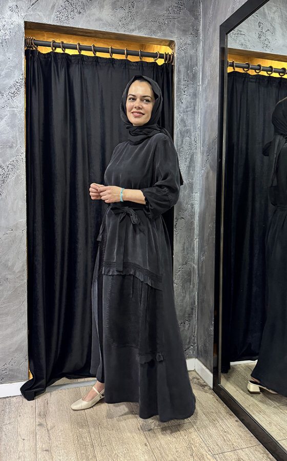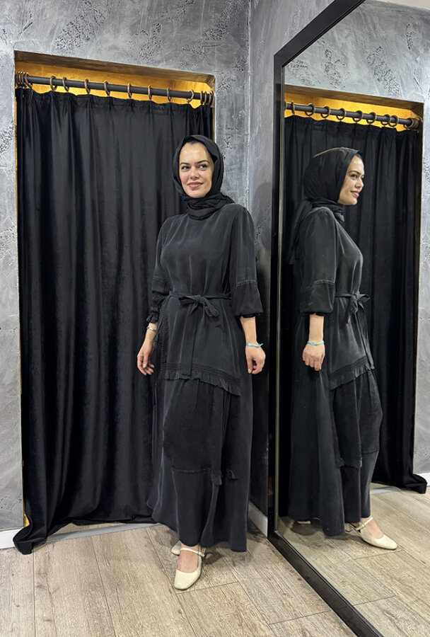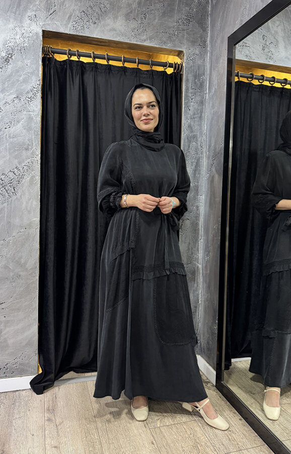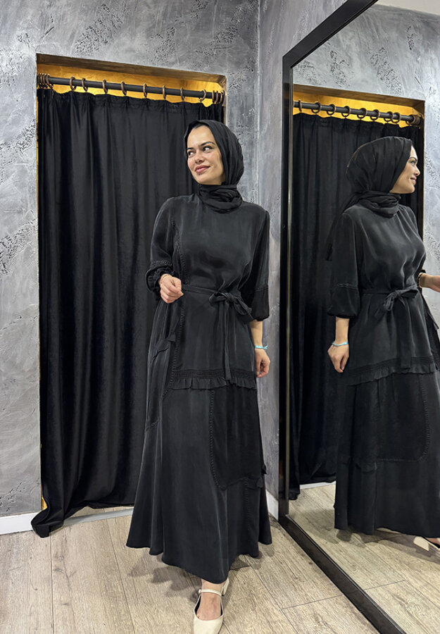 MissWhence Şallı Dantel Detaylı İpek Elbise SİYAH