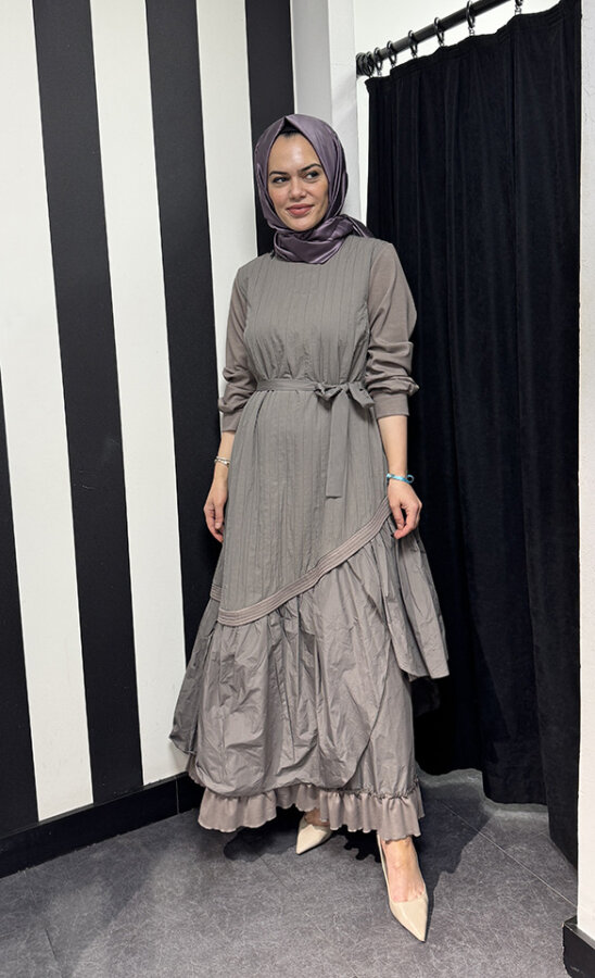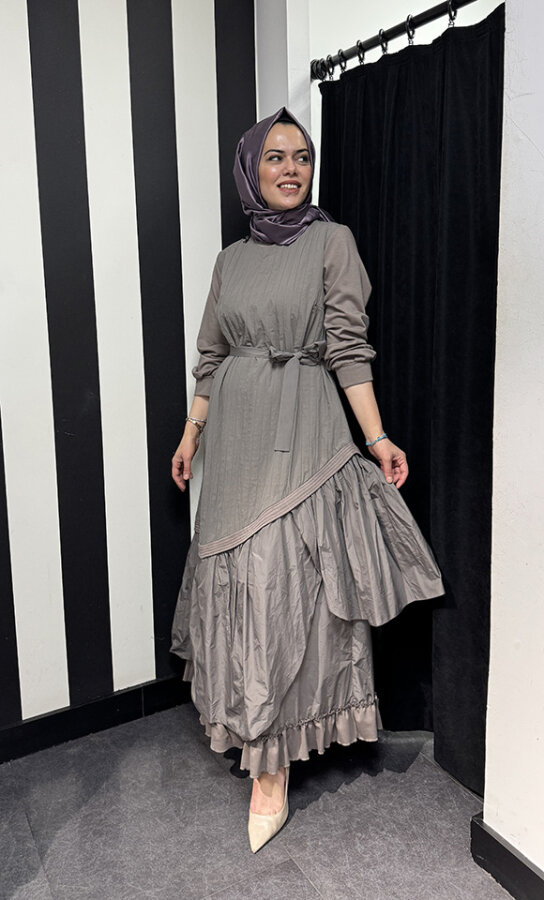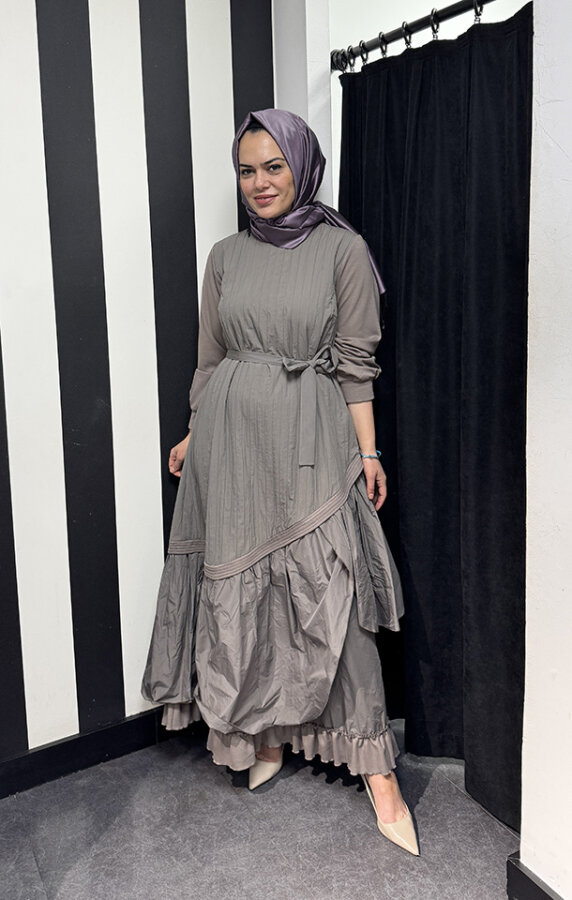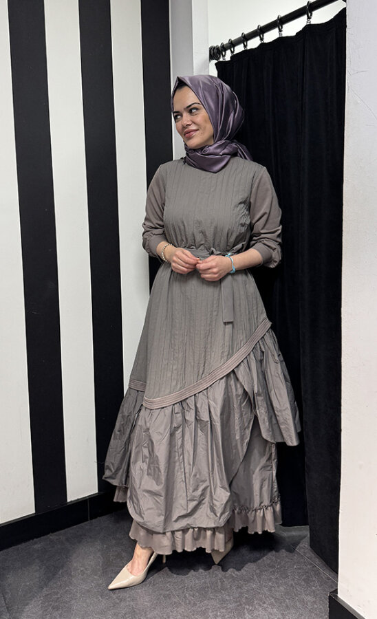 Yeşim Özcan Kolları Taş Detaylı Kat Kat Elbise GRİ