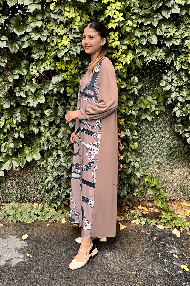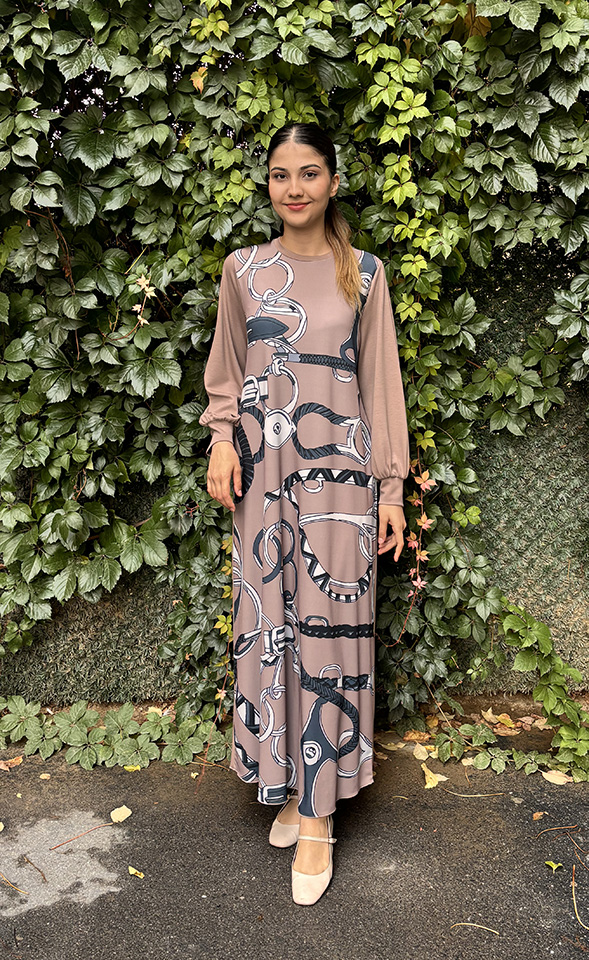 Noi İnce Modal Ön Büyük El Çizimi Rain Desenli Elbise VİZON