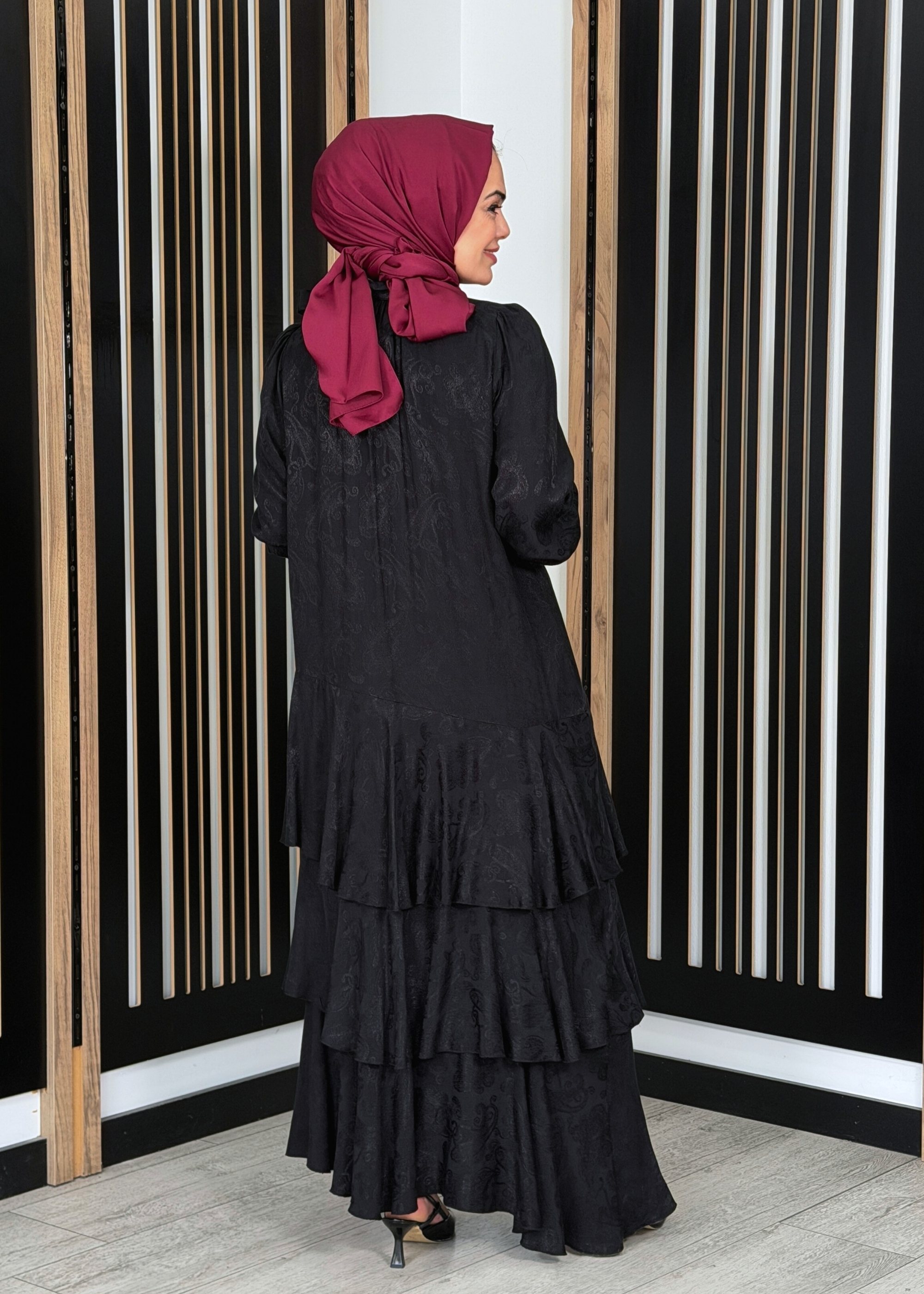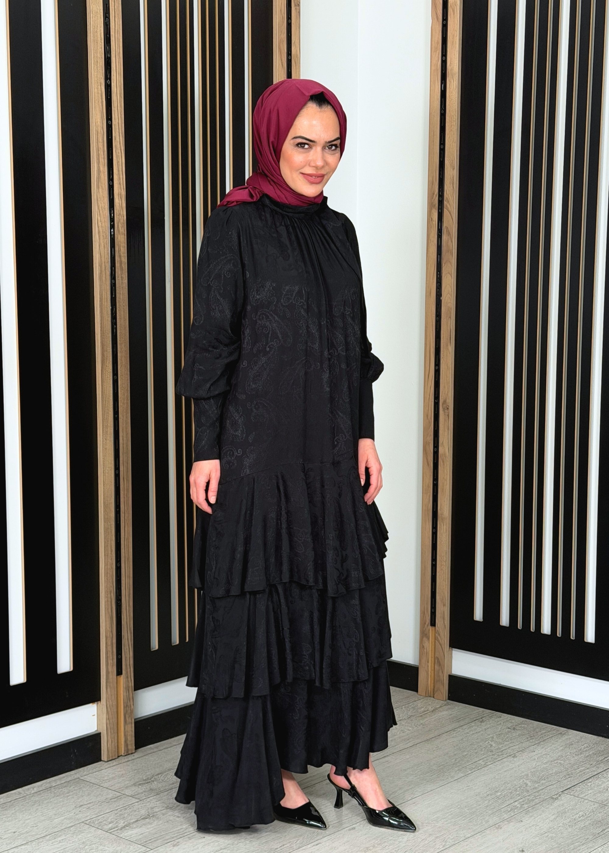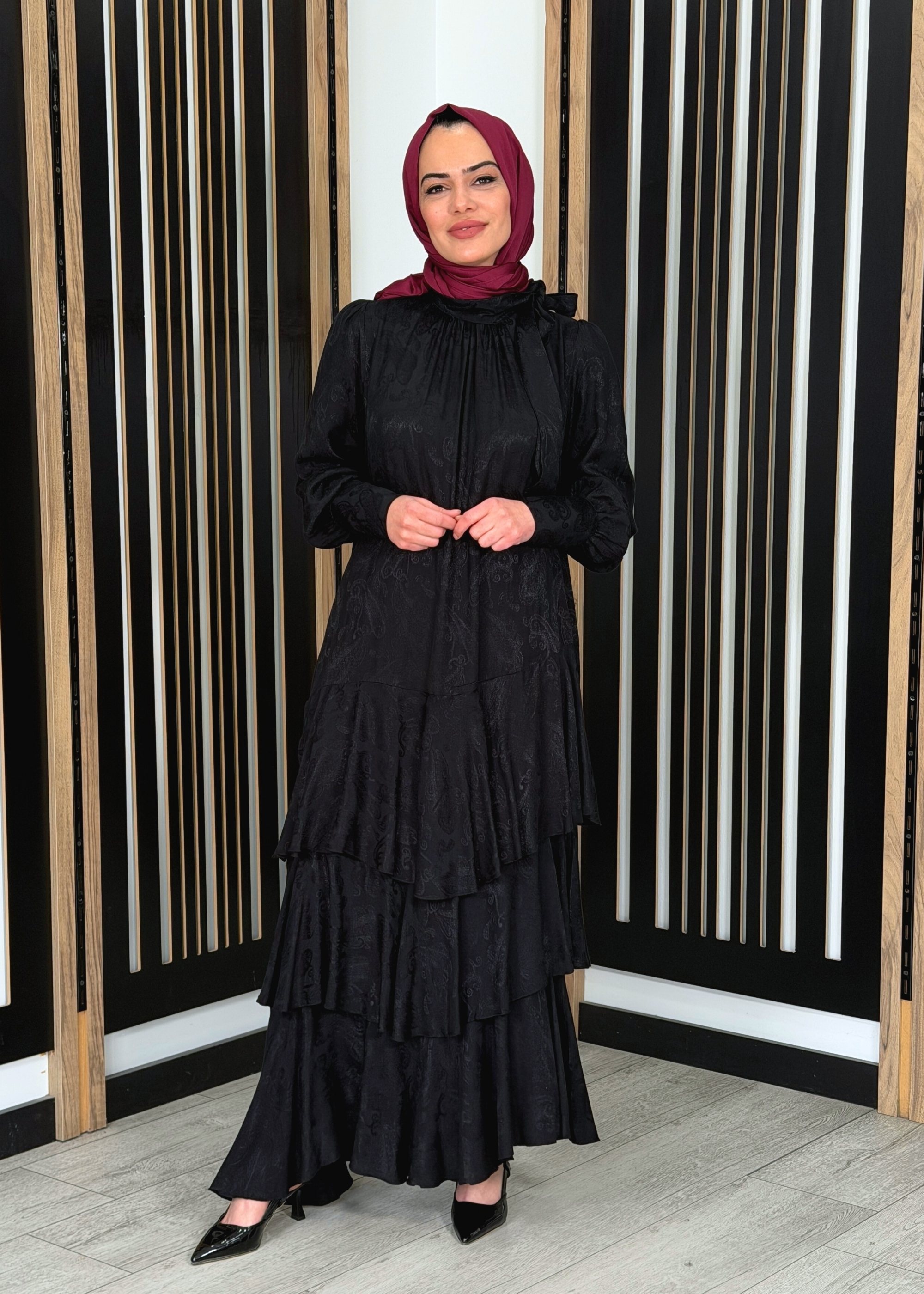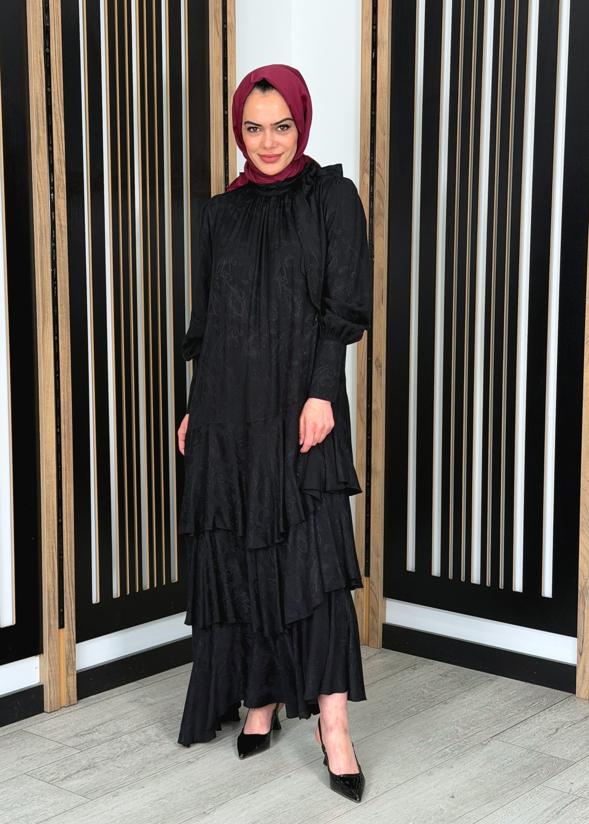 Noİ Jakar Viscon Üçkatlı Volanlı Fularlı Elbise SİYAH