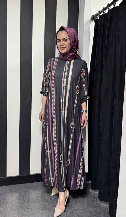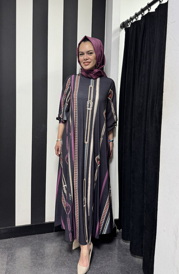 Noi Jarse Boyuna Kemer Zincirli Desenli A Form Elbise SİYAH
