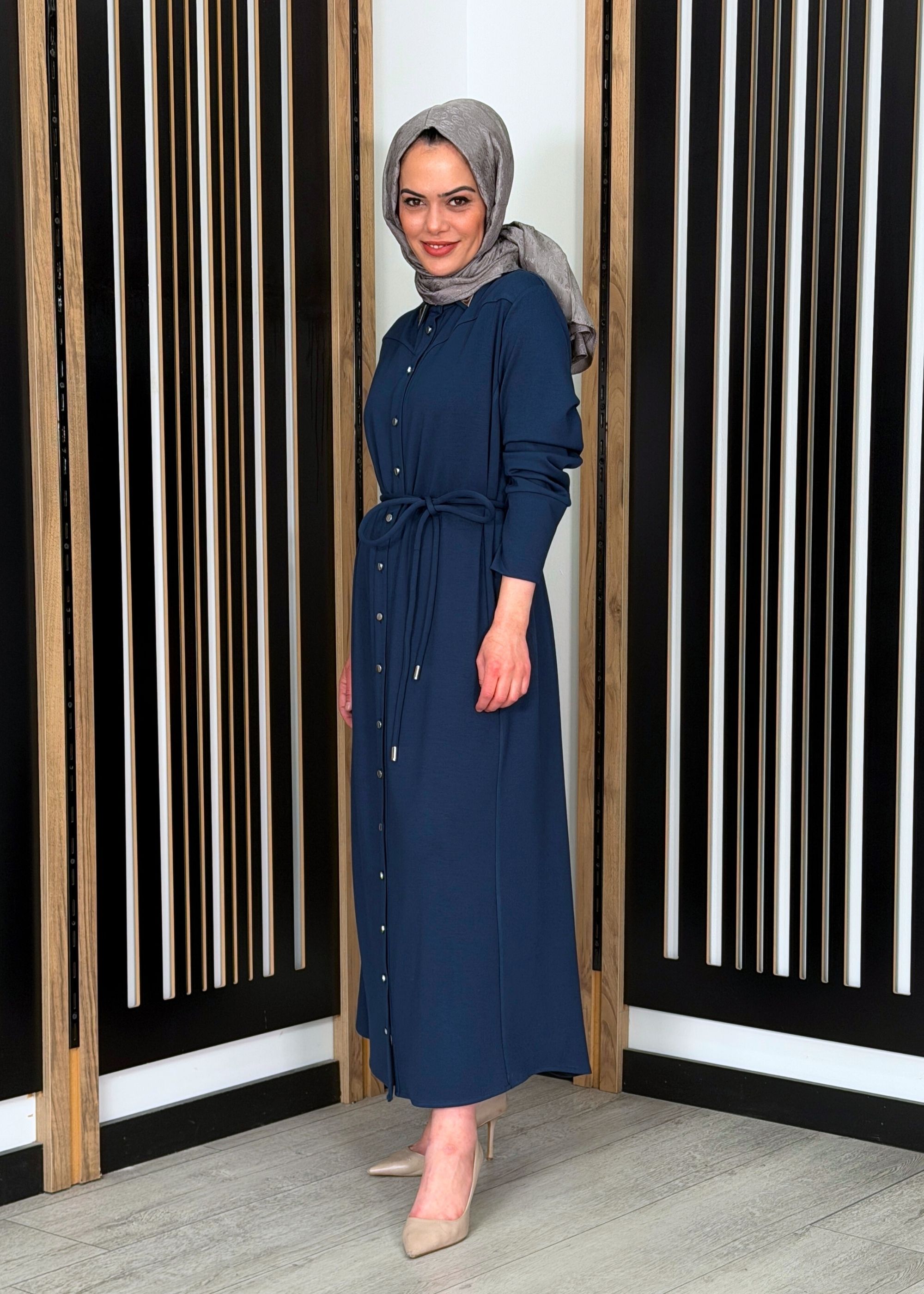 MissWhence Şallı Kuşaklı İpek Elbise LACİVERT