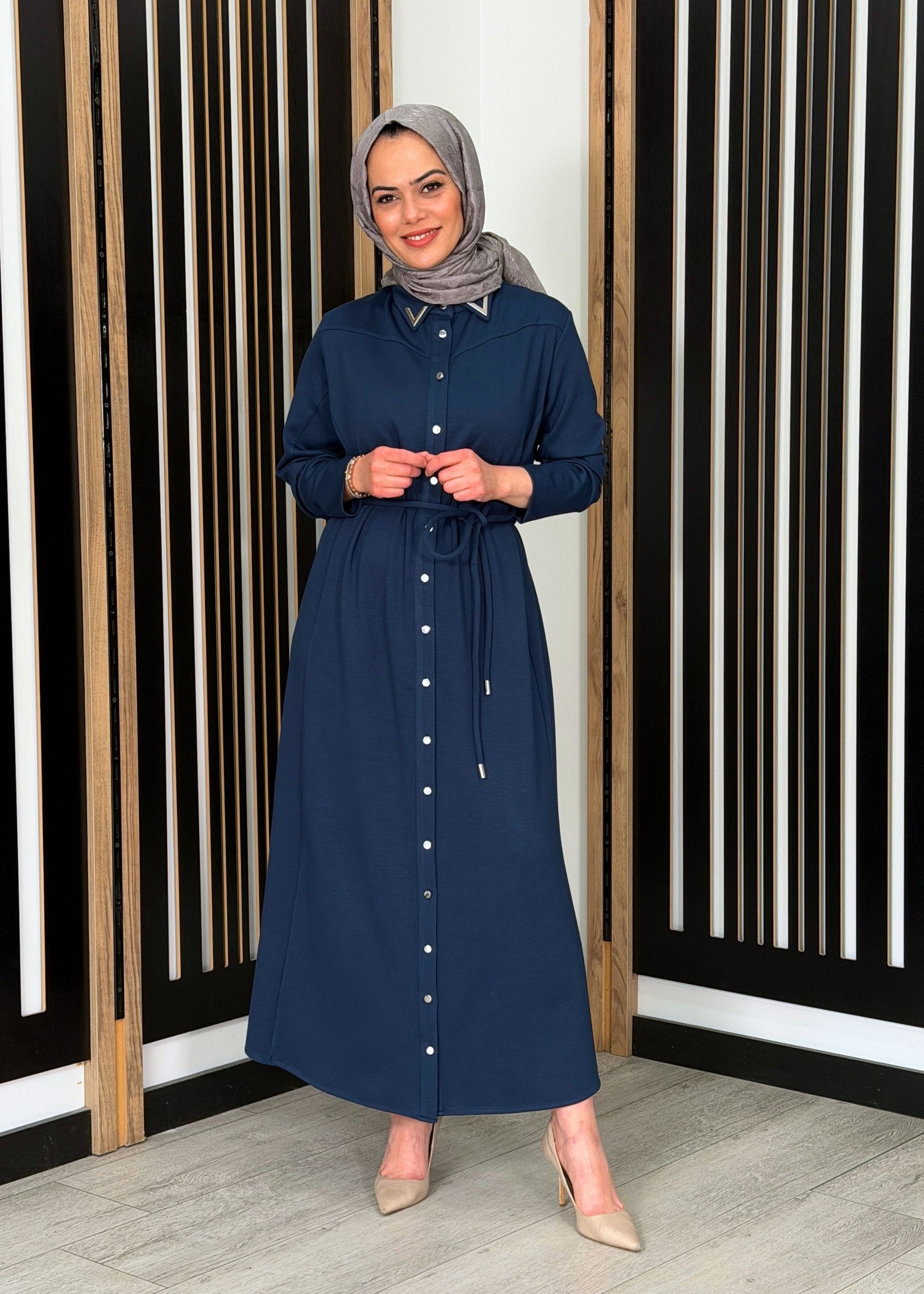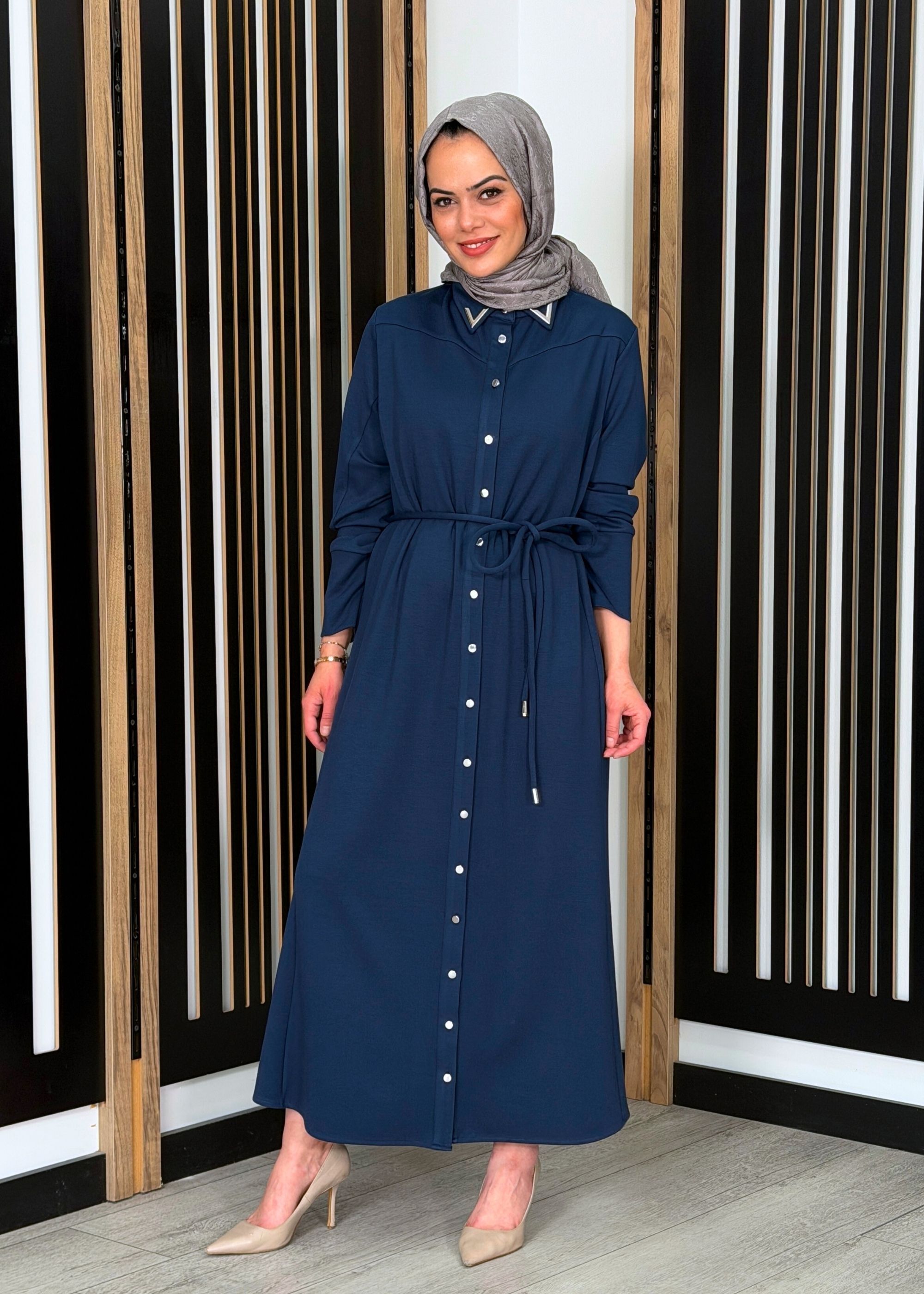 Noİ Modal Yaka Aksesuarlı Kemerli Gömlek Elbise PETROL