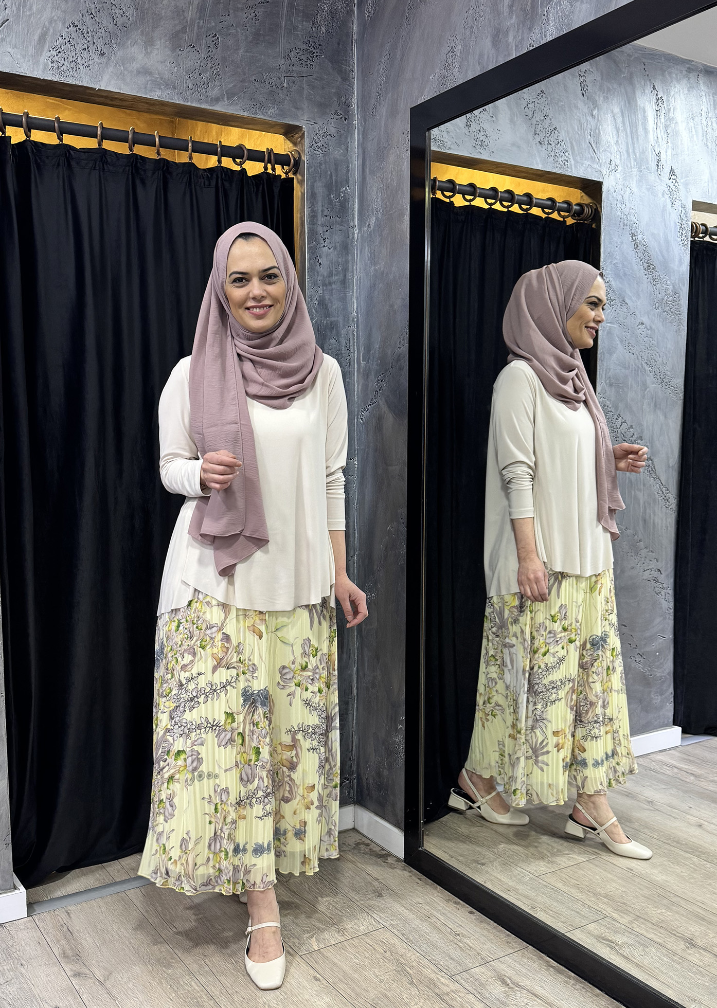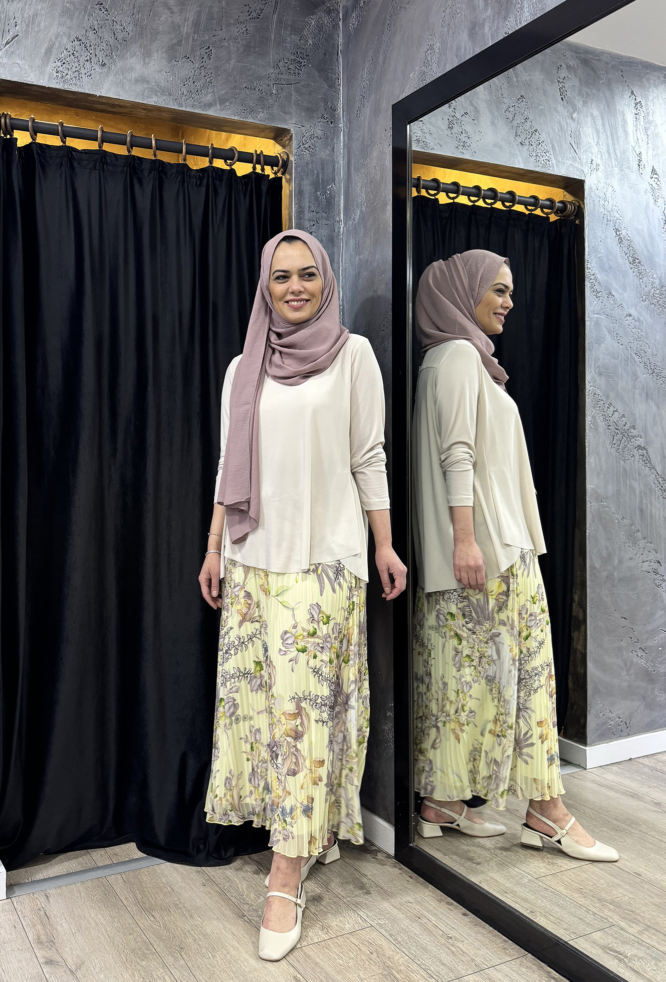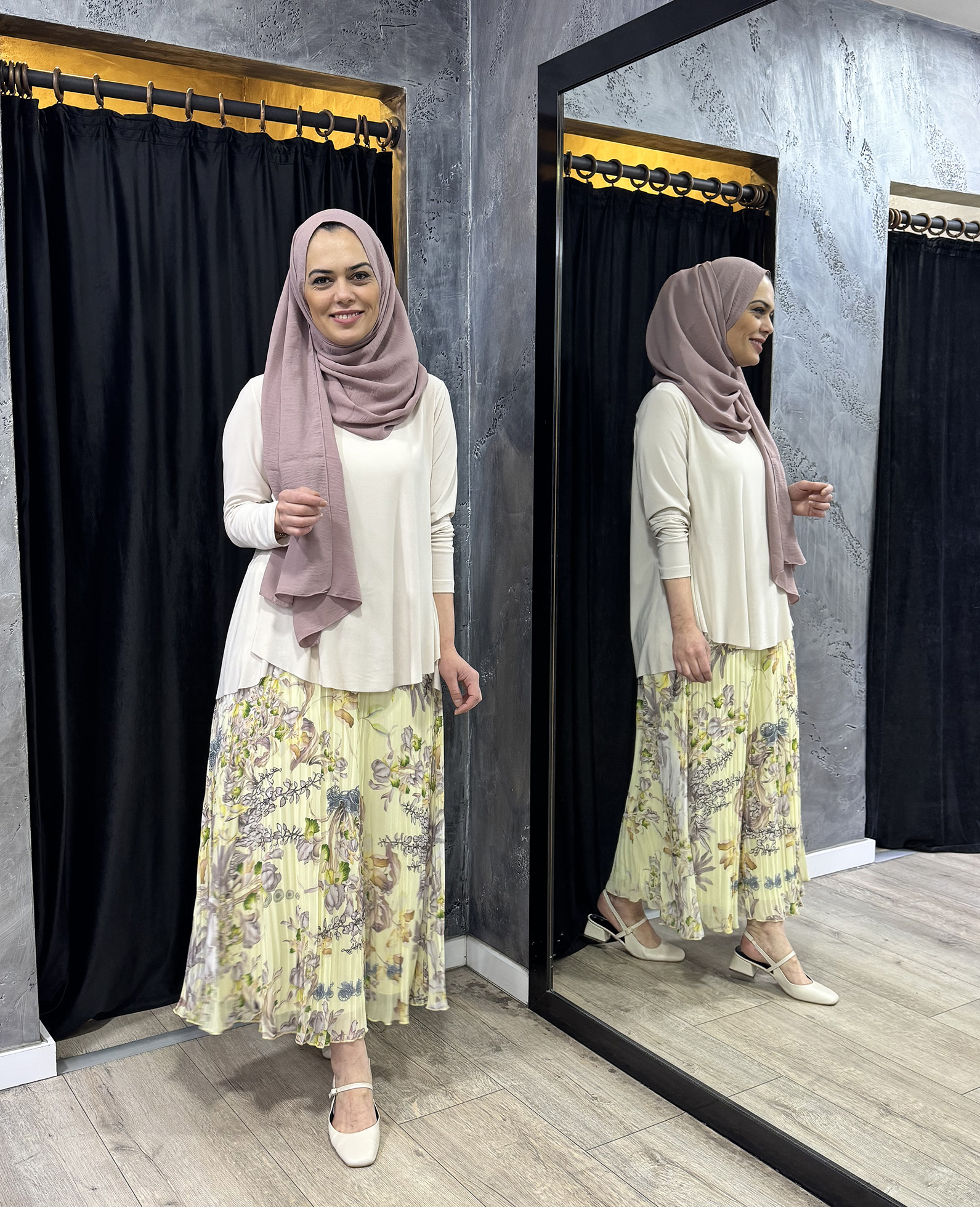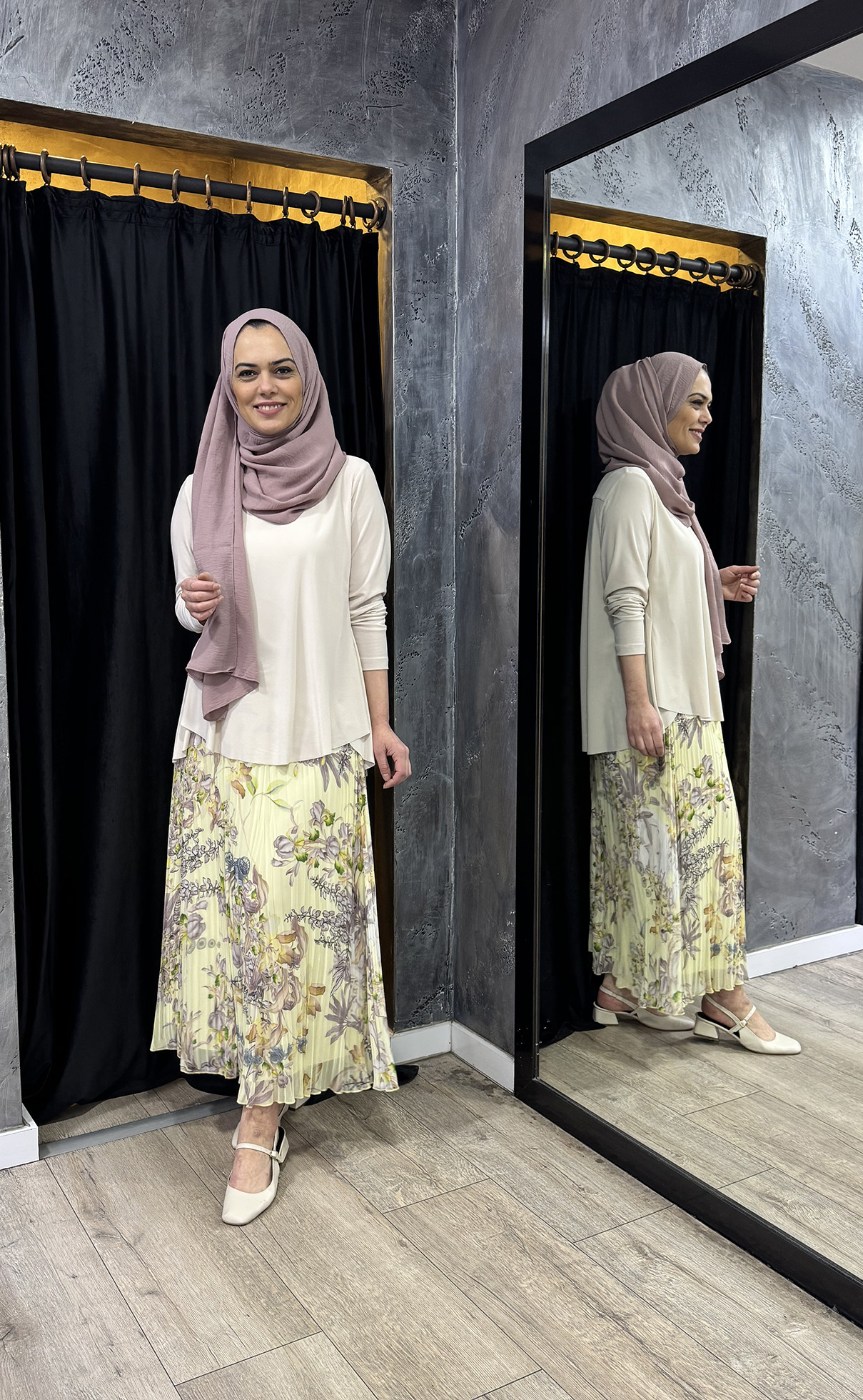 Noi Şifon Fantastik Ortanca Çiçekli Pliseli Etek Açık Sarı