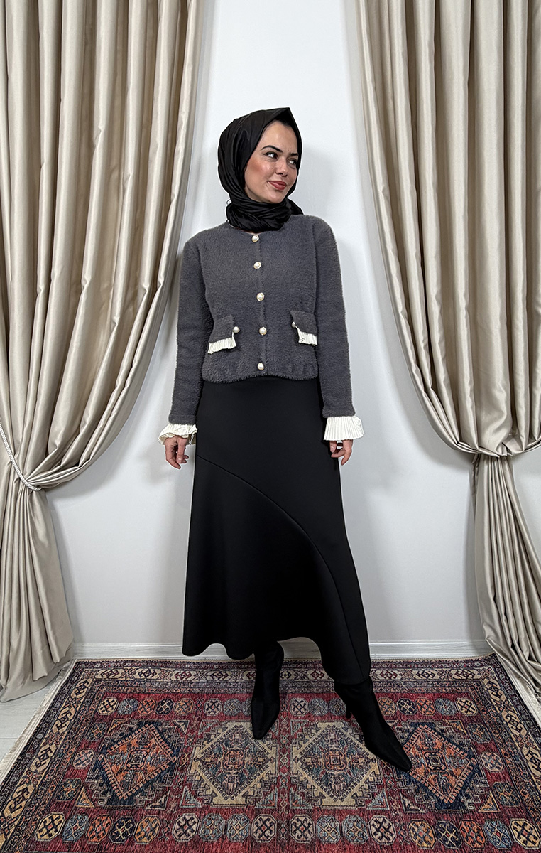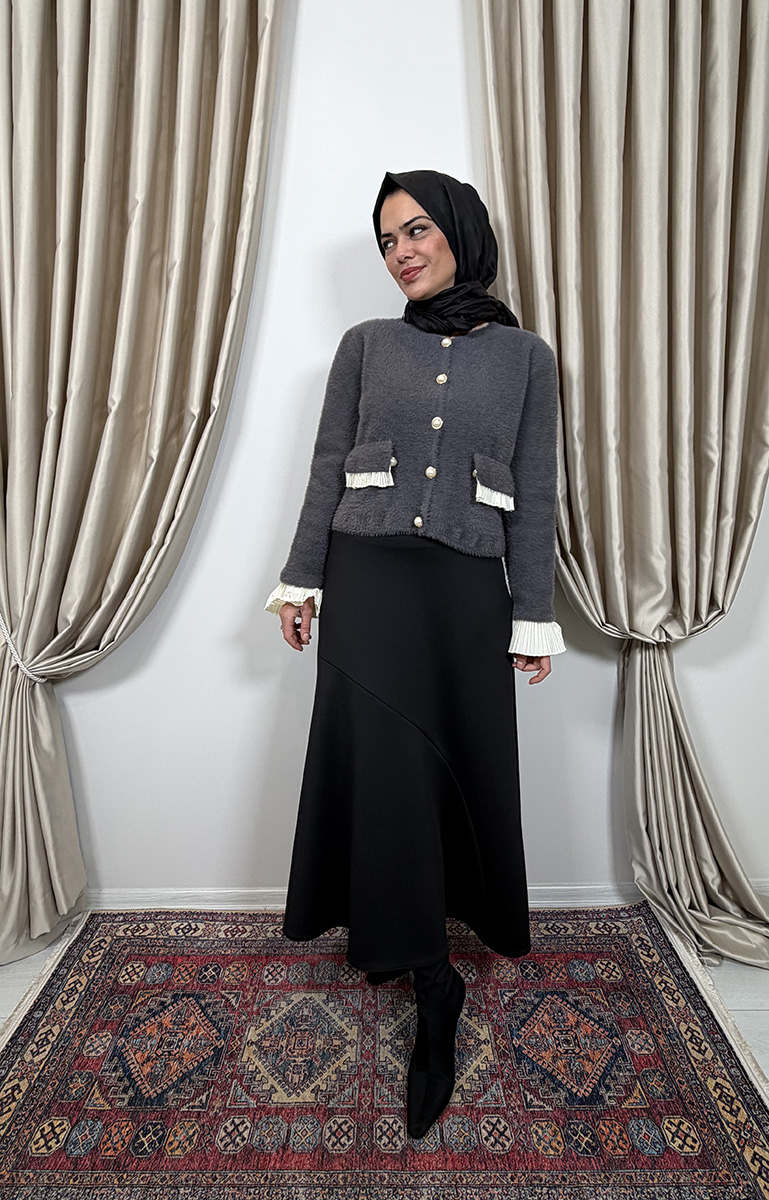 Noi Triko Angora Kol Ve Cepleri Pliseli Kısa Hırka ANTRASİT