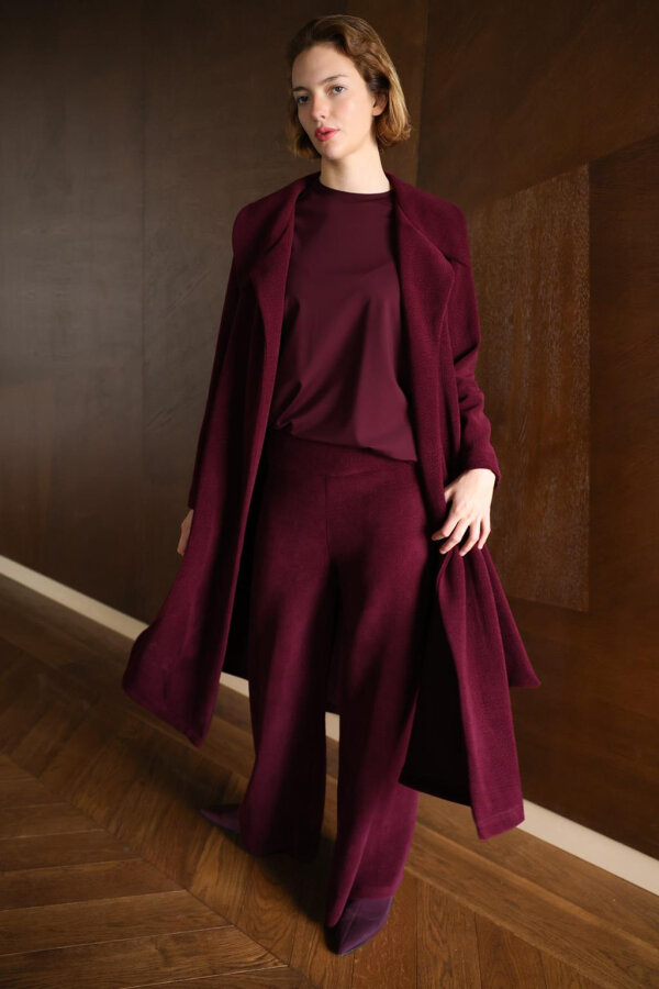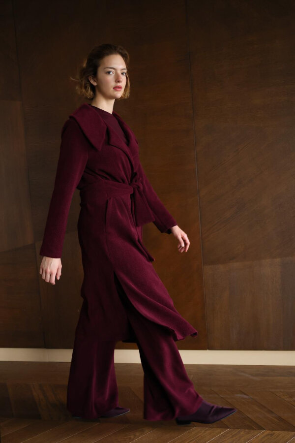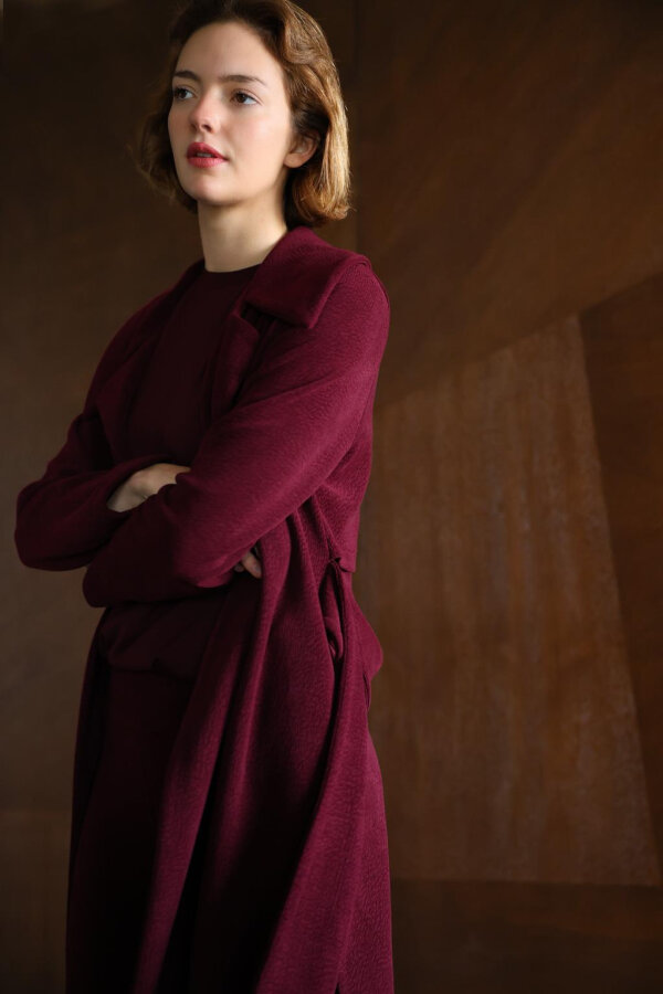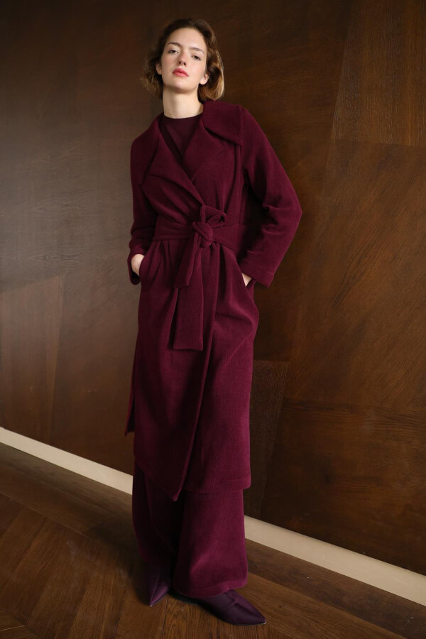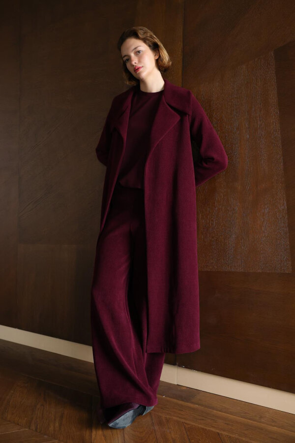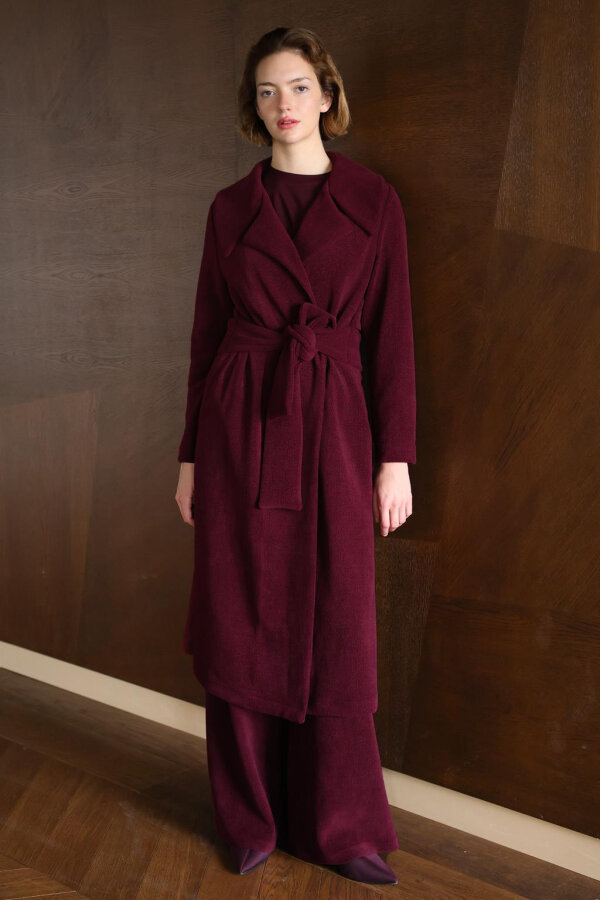 Noi Triko Fitilli Kadife Arkası Kemerli Kaban BORDO